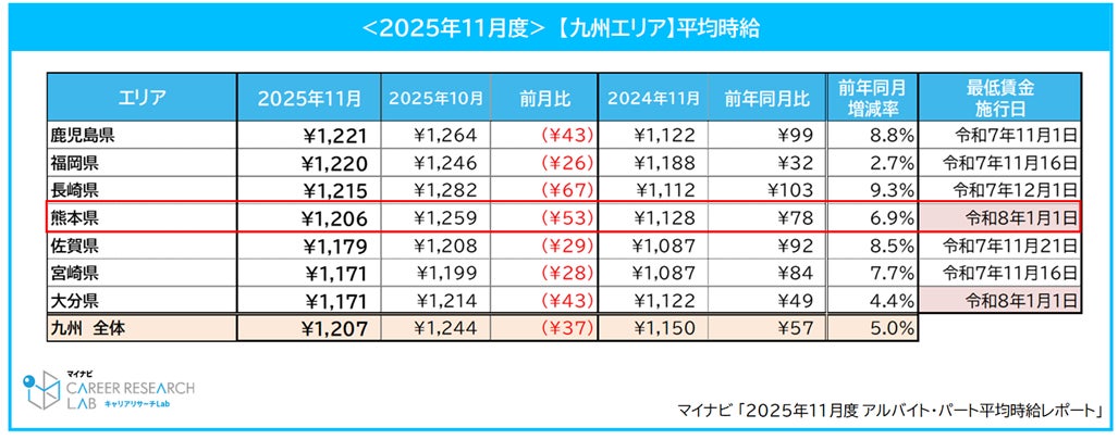 「熊本県」の平均時給は1,206円、前年同月比から78円増加