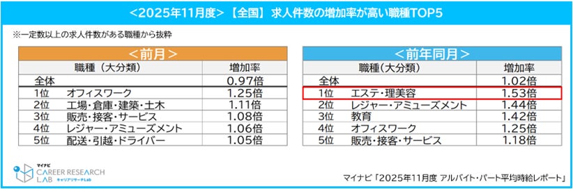 求人件数の増加率では、美容やセルフケアへの関心が高まり、サロンや美容サービスの需要が広がる[エステ・理美容]が前年同月比1.53倍と最も増加した。【図1、2、3】