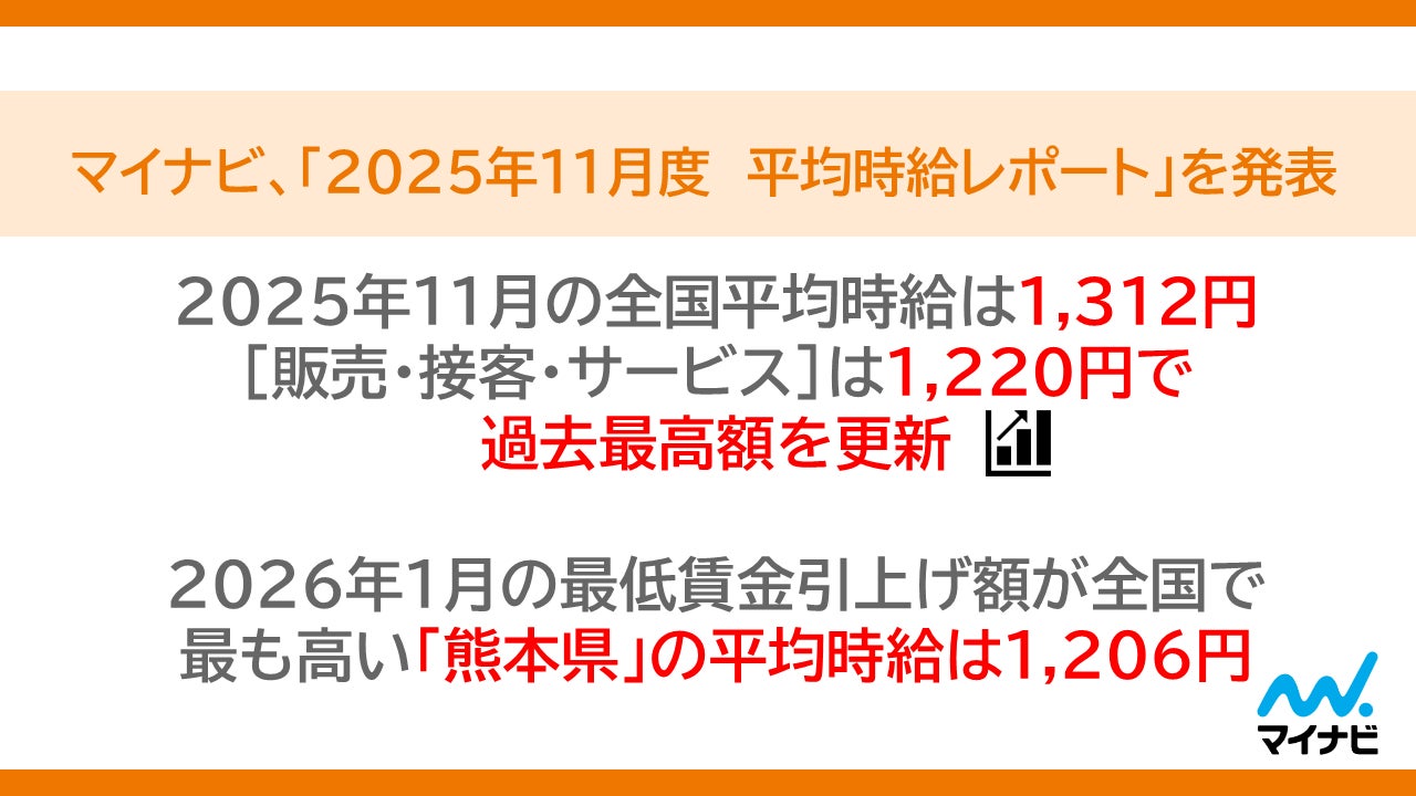 2025年11月の全国平均時給は1,312円。 [販売・接客・サービス]は1,220円で過去最高額を更新。2026年1月の最低賃金引上げ額が全国で最も高い「熊本県」の平均時給は1,206円