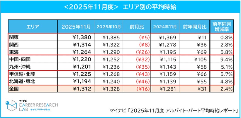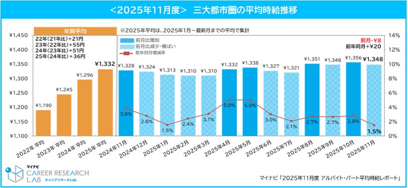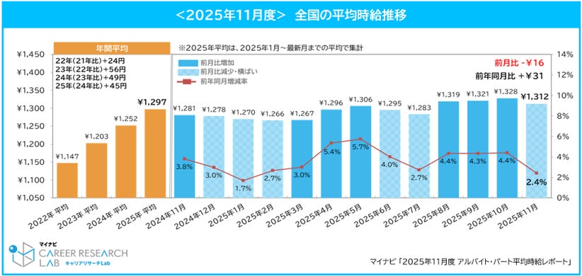 株式会社マイナビ(本社:東京都千代田区、代表取締役 社長執行役員:土屋芳明)は、アルバイト平均時給レポート(2025年11月度)を発表しました。本調査は、アルバイト・パート求人情報サイト『マイナビバイト』(https://baito.mynavi.jp/)に掲載された求人広告データを集計したものです。