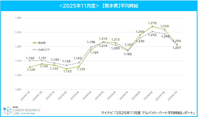 「熊本県」の平均時給は1,206円で、前月比では53円減少しているものの、前年同月比では78円増加した。