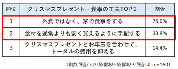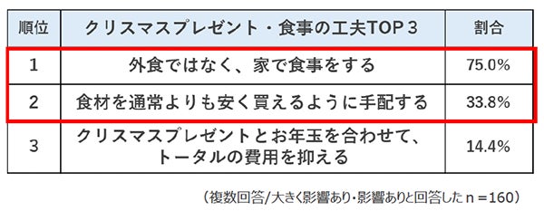 クリスマスプレゼントや食事の金銭面の工夫は、1位「外食ではなく家食」、2位「食材を安く調達」