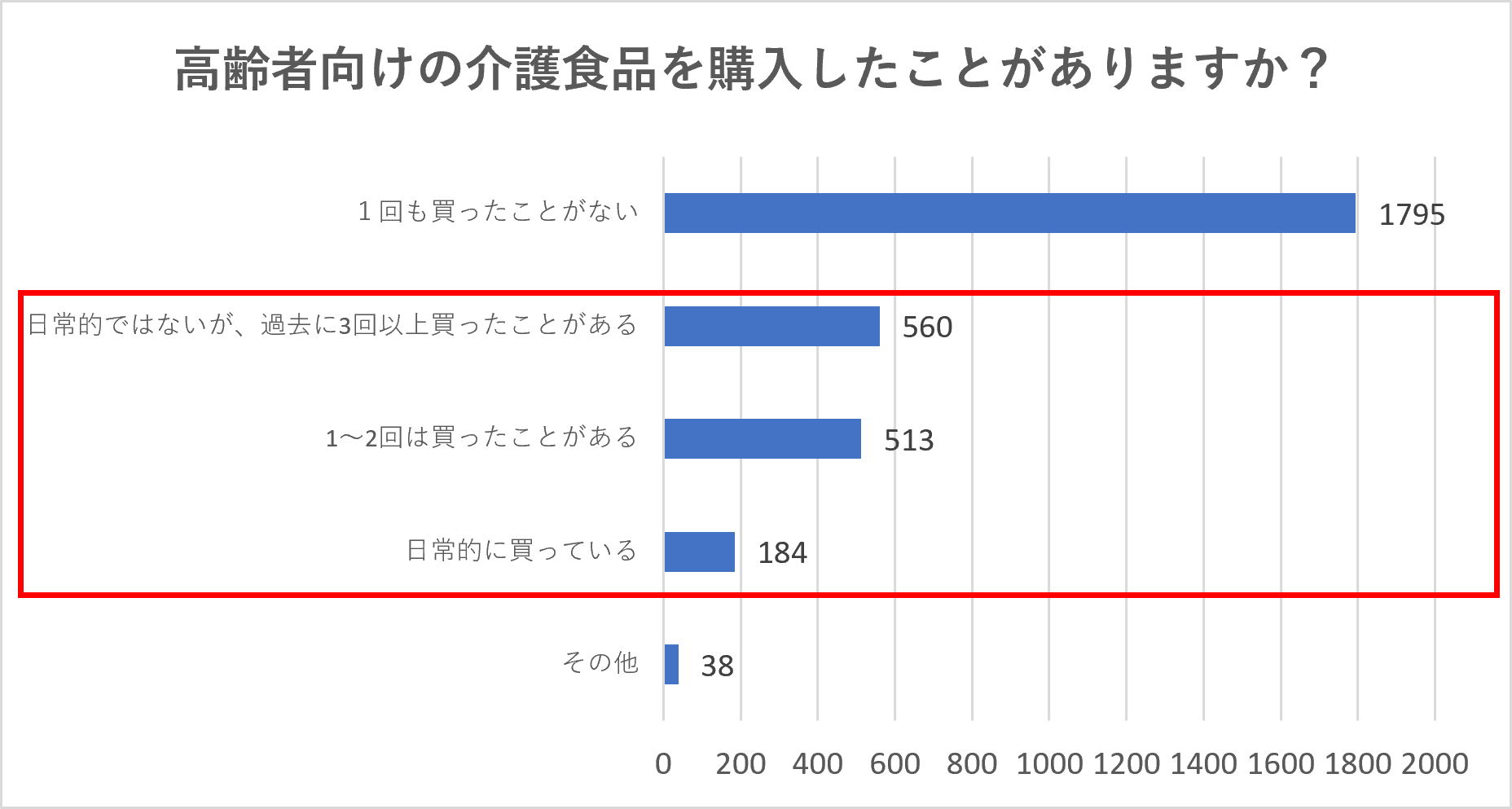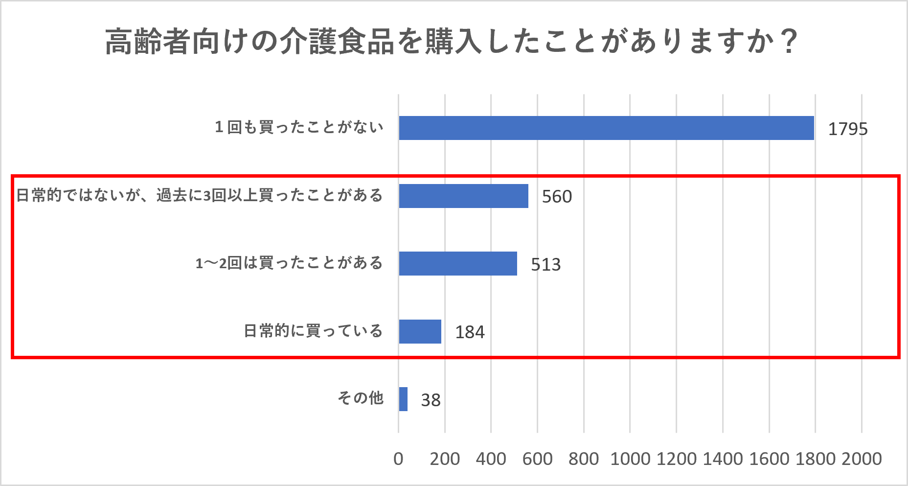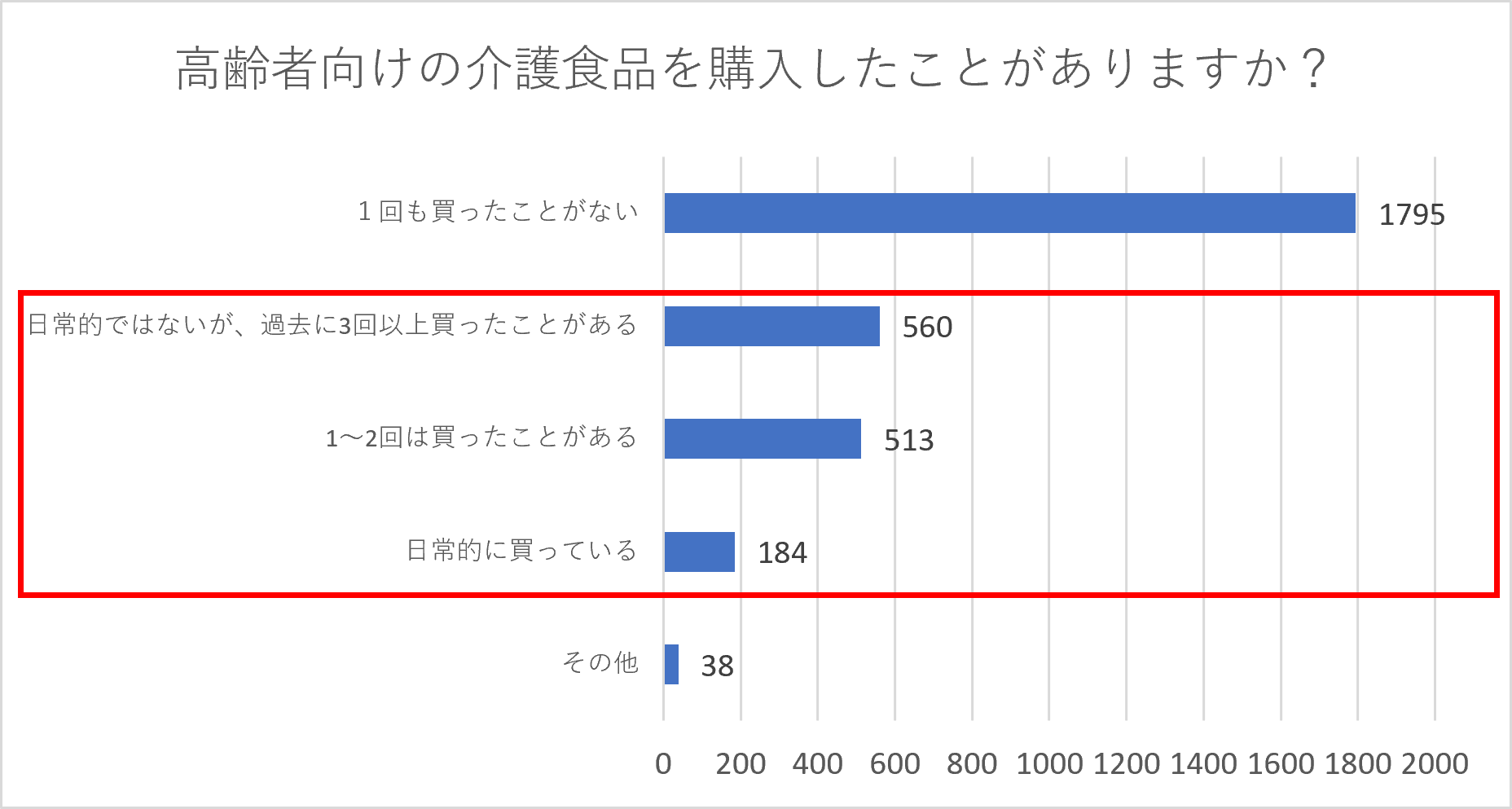 ・介護食品を購入したことがある人は全体の約40%でした。「直接購入はしていないが、親族が施設で提供されている」「以前は買っていた」という回答もありました。