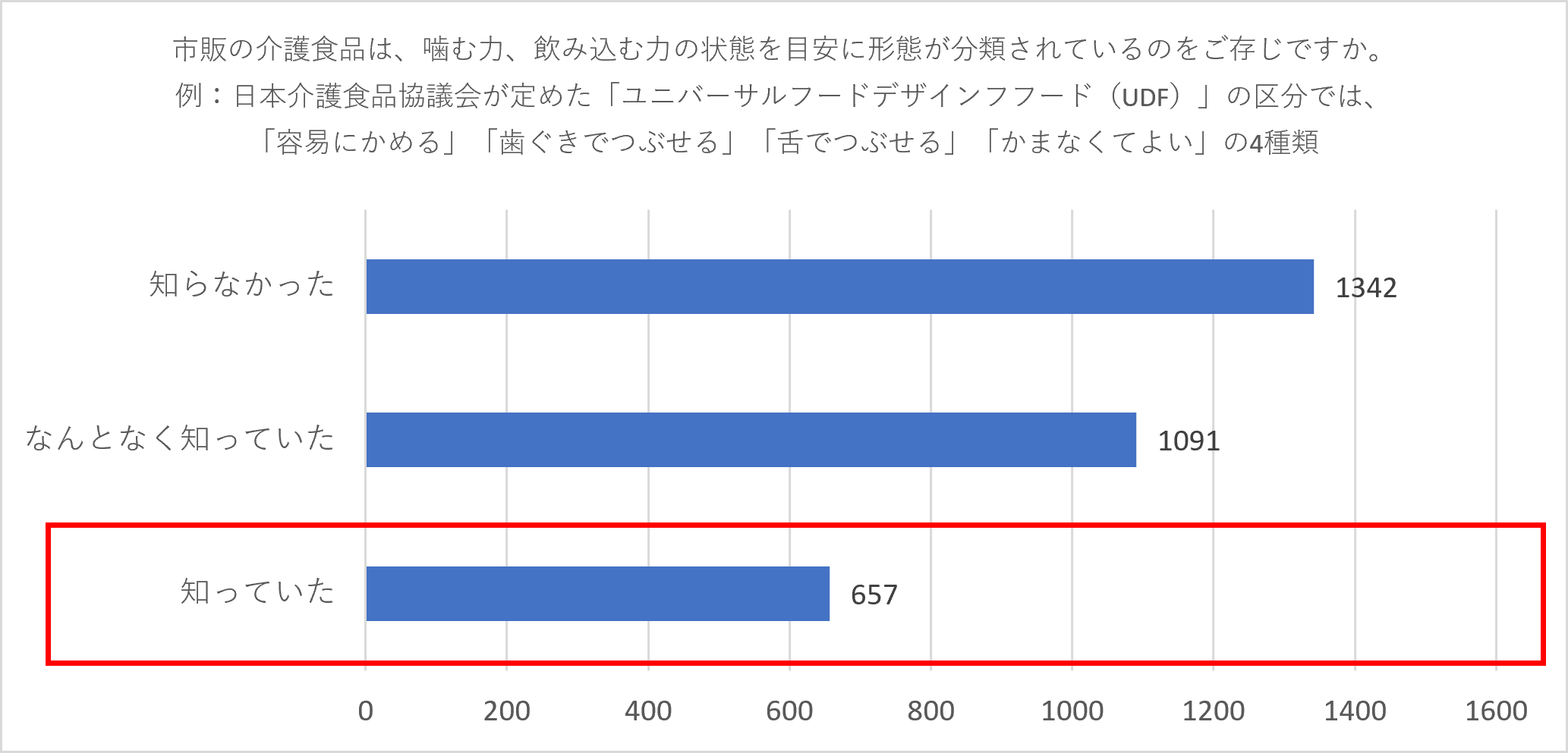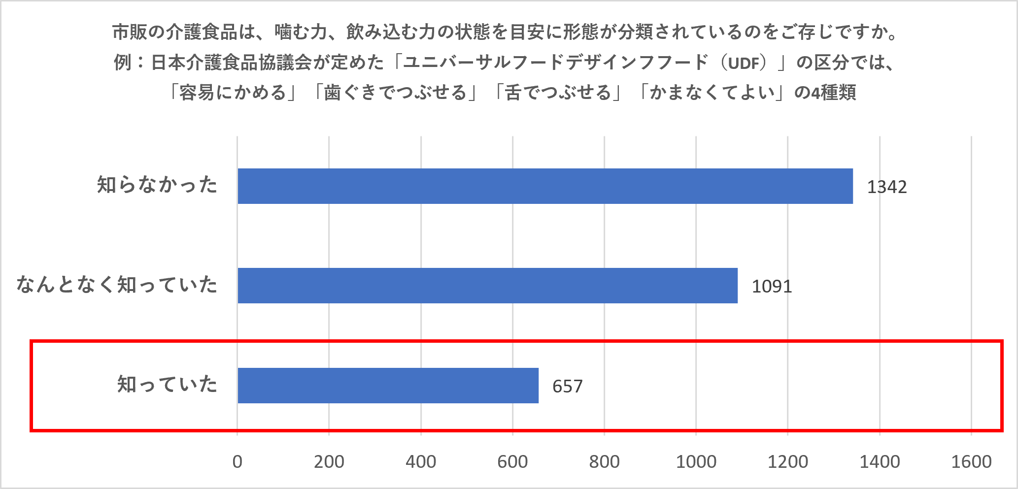 ・市販の介護食品は、噛む力、飲み込む力を目安に分類されていますが、そうした分類が設定されていることを「知っていた」人は約21%でした。介護食品を購入したことのある人のおよそ半分にあたり、介護食品を購入したことはあったとしても、分類を認識していない人もいることが分かりました。