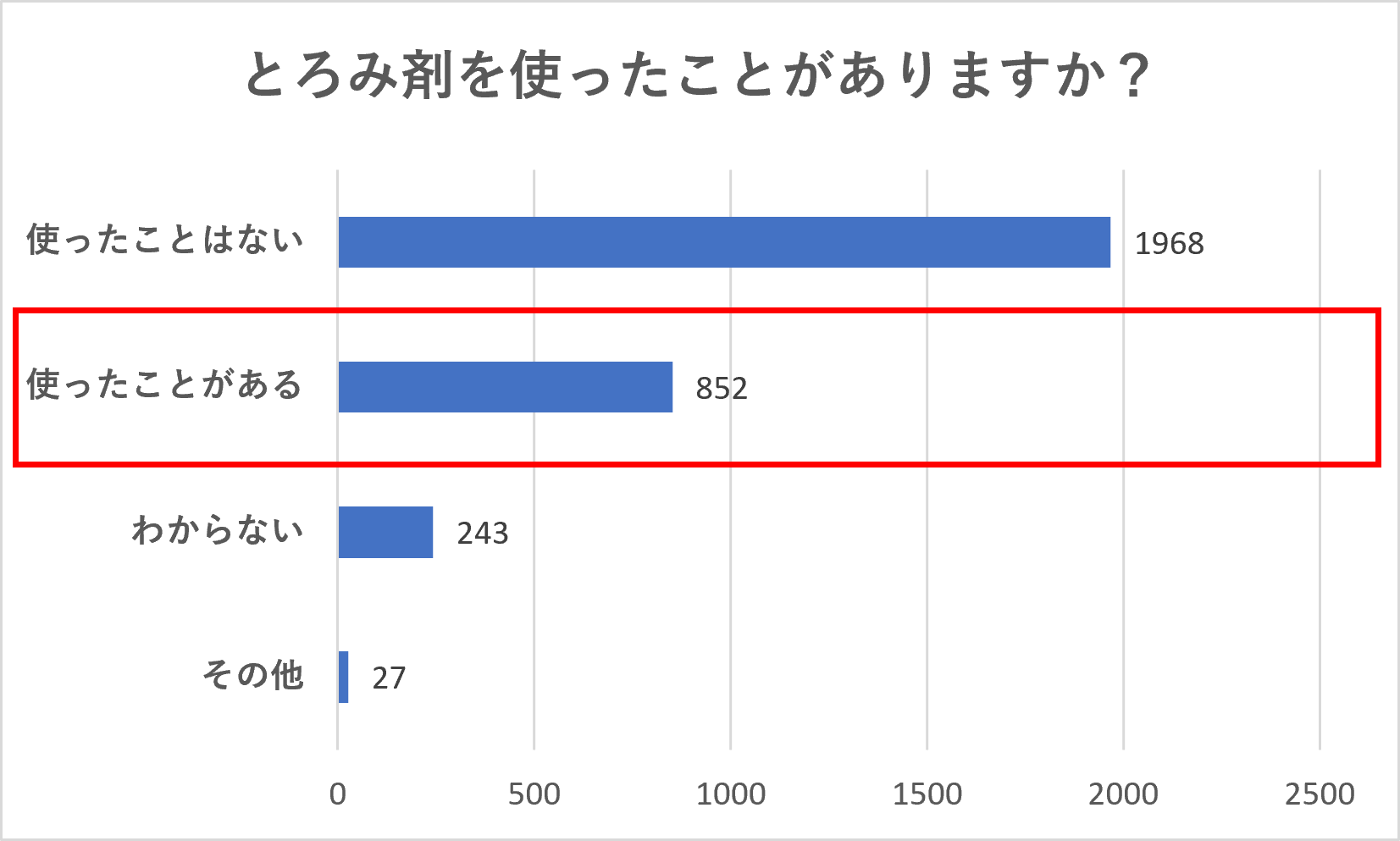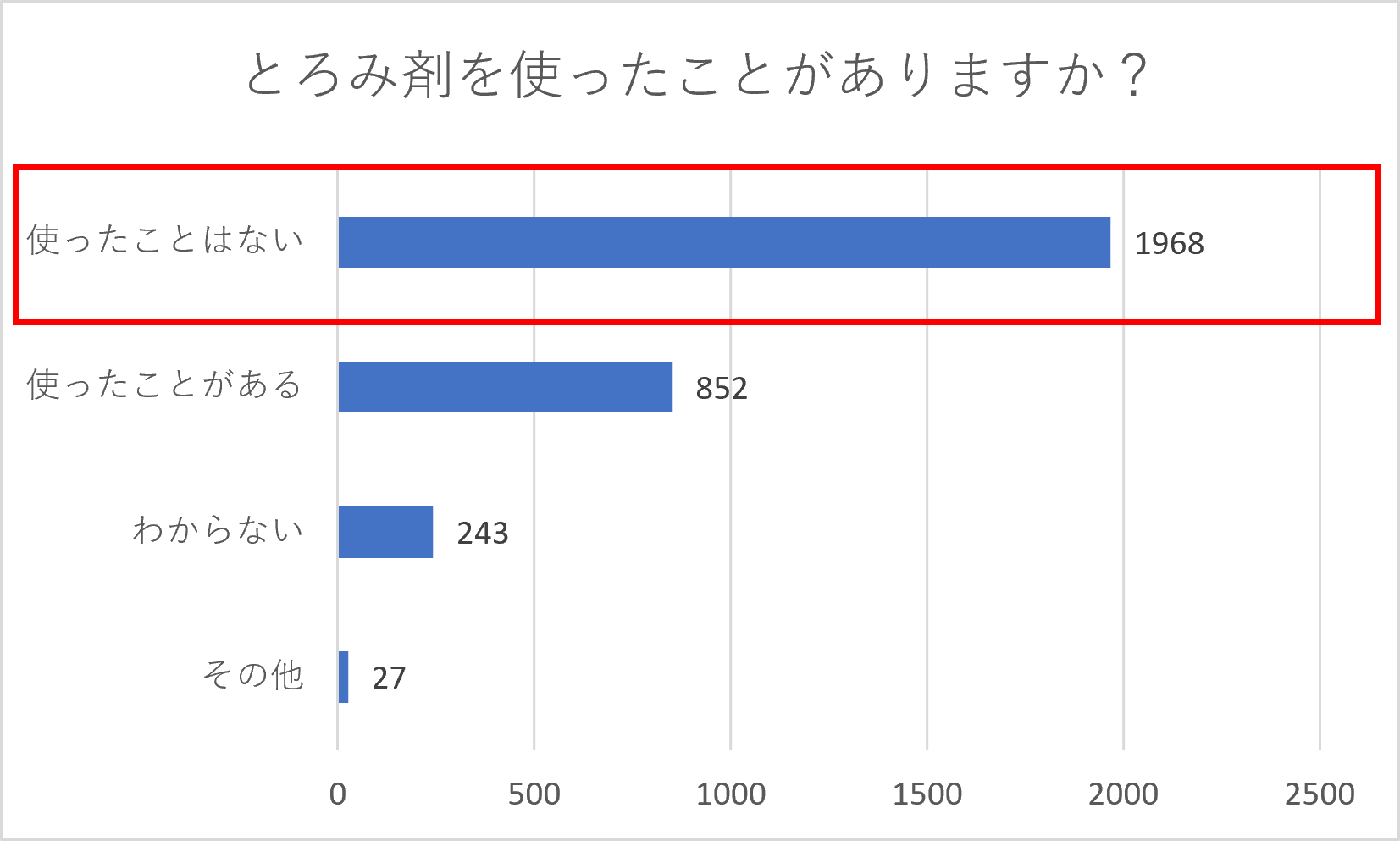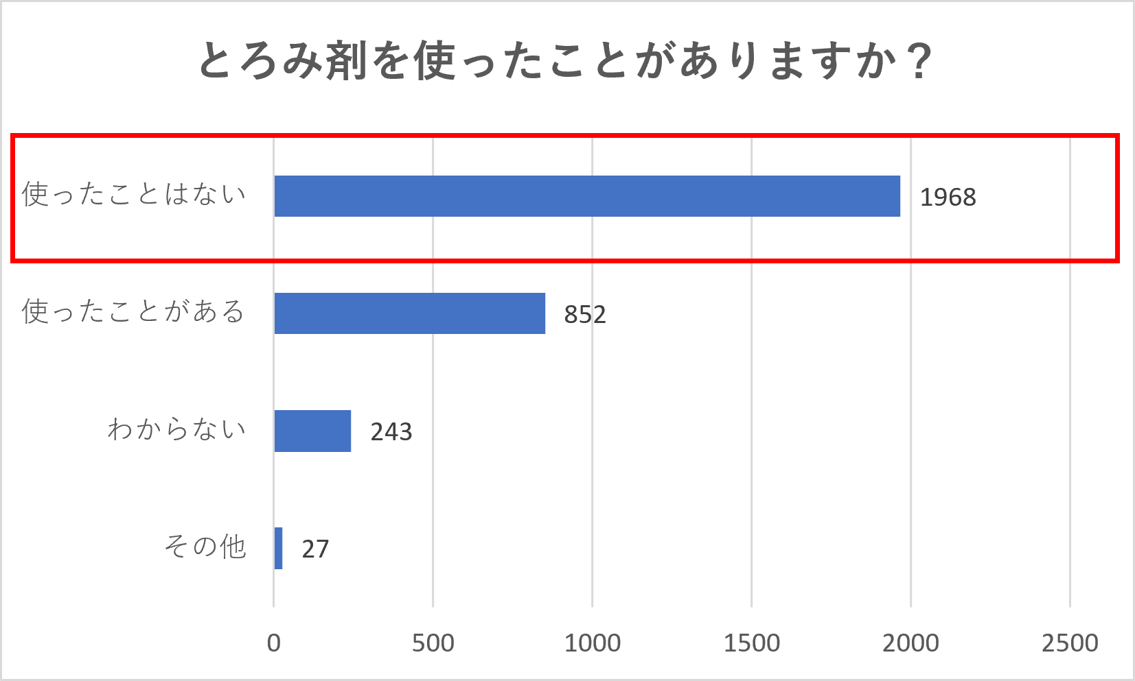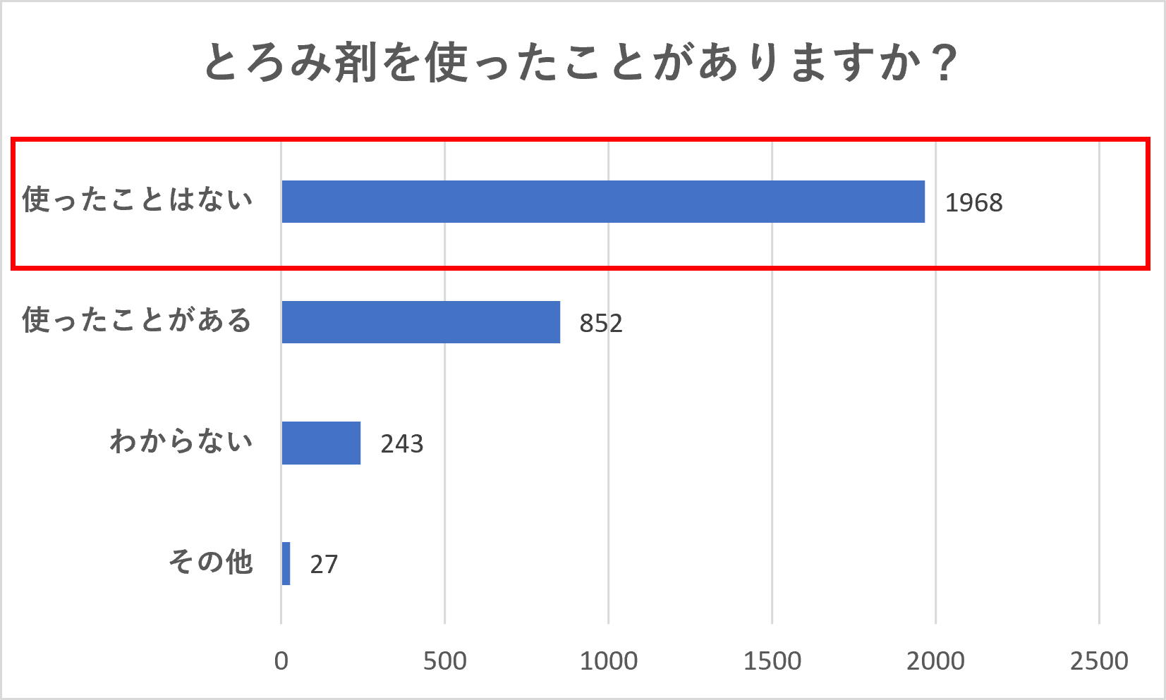 ・とろみ剤を使用したことがある人は約27.5%でした。「毎日使用している」と答える人もいる一方で、代替品として「片栗粉を使用している」といった方がいたほか、「糖分量が気になる」という回答も見られました。