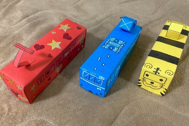 A4サイズの色画用紙にプリントした電車型のペーパークラフトに好きな柄を描いたり、好きなシールを貼ってオリジナルの電車を作ります。
