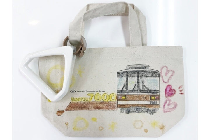 神戸市営地下鉄北神線で活躍した7000系のイラスト入りトートバッグにクレヨンでぬり絵をします。アクセントにつり革(7000系廃材)を取り付けて、オリジナルトートバッグのできあがり。