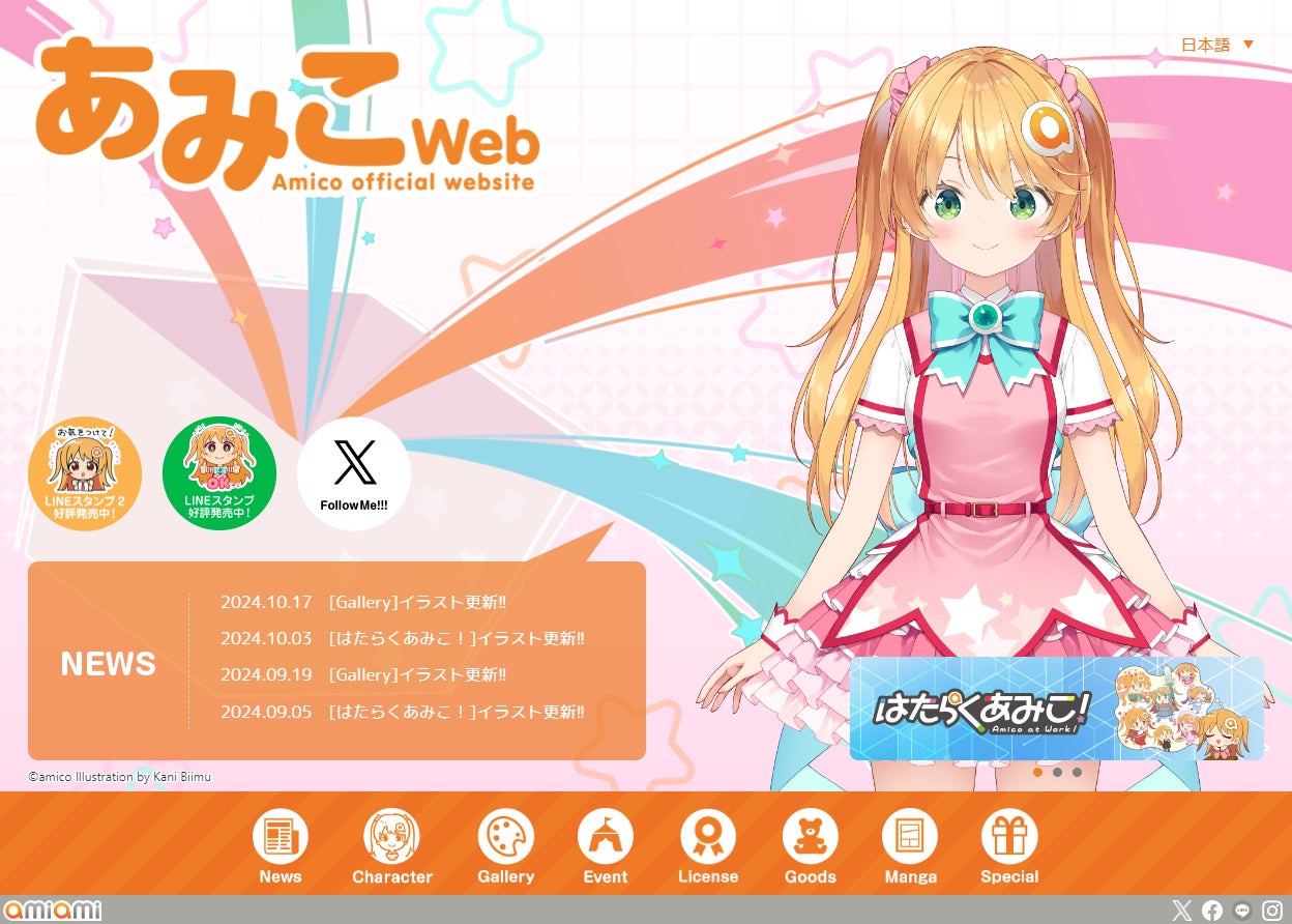 「あみこ」の公式ホームページ。様々なイラストレーターが描く「あみこイラスト」、あみこ参加イベントの情報などを掲載。この他に、三面図・設定画も掲載し立体イベントでの「アマチュア版権」「法人版権」の受付も行っています。