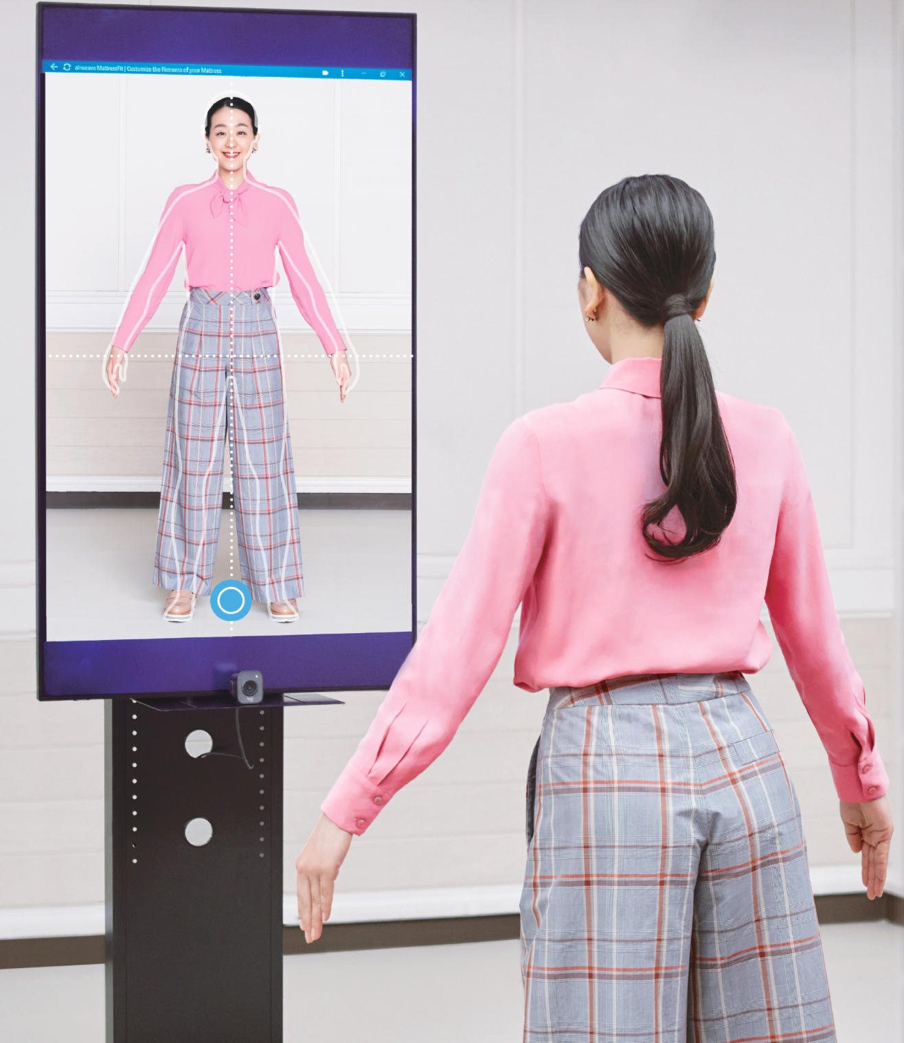 基本情報を入力し、正面と側面の写真撮影を行うだけで<エアウィーヴ>が蓄積したデータから一人ひとりに適応なマットレスの硬さパターンを判定。(測定時間:約3分)体格・体系に合った硬さパターンにカスタマイズできる<エアウィーヴ>ベッドマットレスをご提案いたします。
