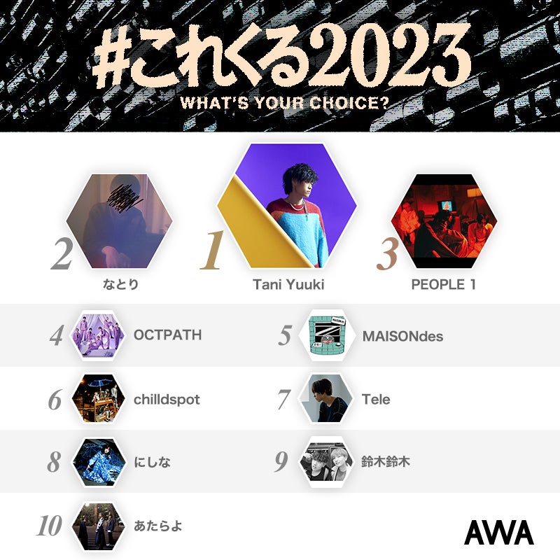 3位に入賞したのは、話題のTVアニメ『チェンソーマン』エンディングテーマ「DOGLAND」が大きな話題となった、東京を拠点に活動するバンドPEOPLE 1。その他にも、『PRODUCE 101 JAPAN SEASON2』に出演した元練習生により結成された8人組ボーイズグループのOCTPATHや、架空の六畳半アパートに住む同じ時代を生きるアーティストたちが、自由にコラボレーションし楽曲を生み出すMAISONdesなど、音楽メディアやSNSを中心に注目を集めているアーティストが名を連ねています。今回AWAでは、トップ30までのアーティストの楽曲を集めたプレイリストを公開。ぜひ、各種メディアからの注目度も高いAWAユーザーが選ぶ!2023年にくるアーティストのランキングと楽曲をお楽しみください。