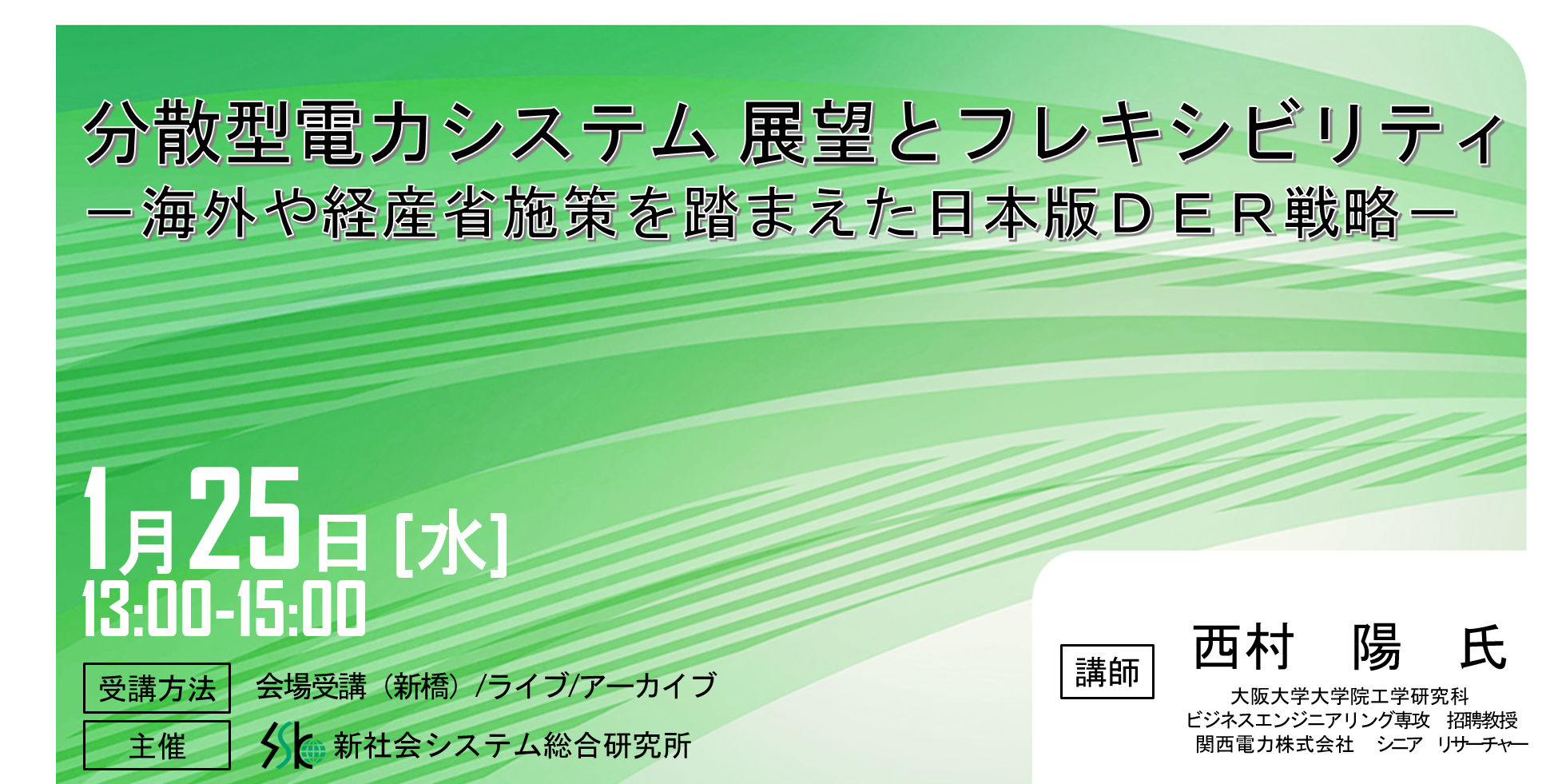 「分散型電力システム 展望とフレキシビリティ」と題して大阪大学大学院工学研究科 招聘教授/関西電力(株) シニア リサーチャー 西村 陽氏のセミナーを2023年1月25日(水)に開催!!