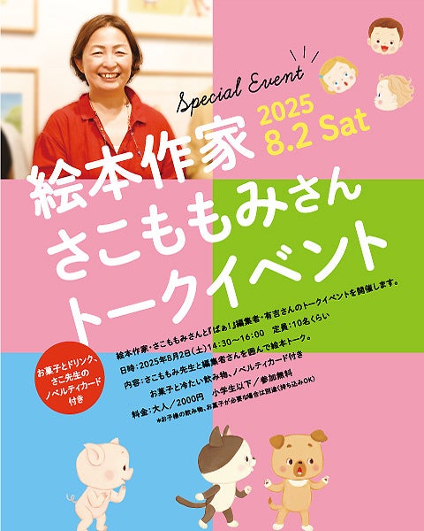 内容:さこ先生と編集者さんを囲んで絵本トーク。お菓子と冷たい飲み物、さこ先生のノベルティカード付き