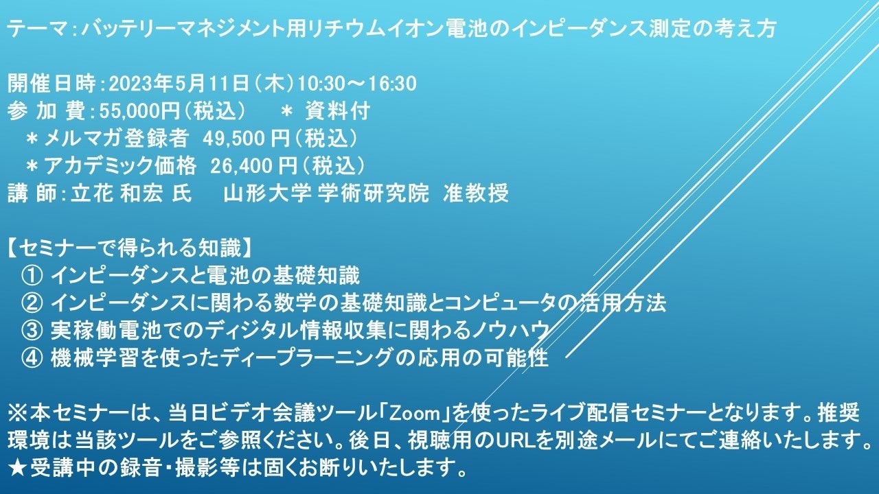 先端技術情報や市場情報を提供している(株)シーエムシー・リサーチ(千代田区神田錦町: https://cmcre.com/ )では、 各種材料・化学品などの市場動向・技術動向のセミナーや書籍発行を行っておりますが、 このたび「バッテリーマネジメント用リチウムイオン電池のインピーダンス測定の考え方」と題するセミナーを、 講師に立花 和宏 氏 (山形大学 学術研究院 准教授)をお迎えし、2023年5月11日(木)10:30より、 ZOOMを利用したライブ配信で開催いたします。 受講料は、 一般:55,000円(税込)、 弊社メルマガ会員:49,500円(税込)、 アカデミック価格は26,400円(税込)となっております(資料付)。