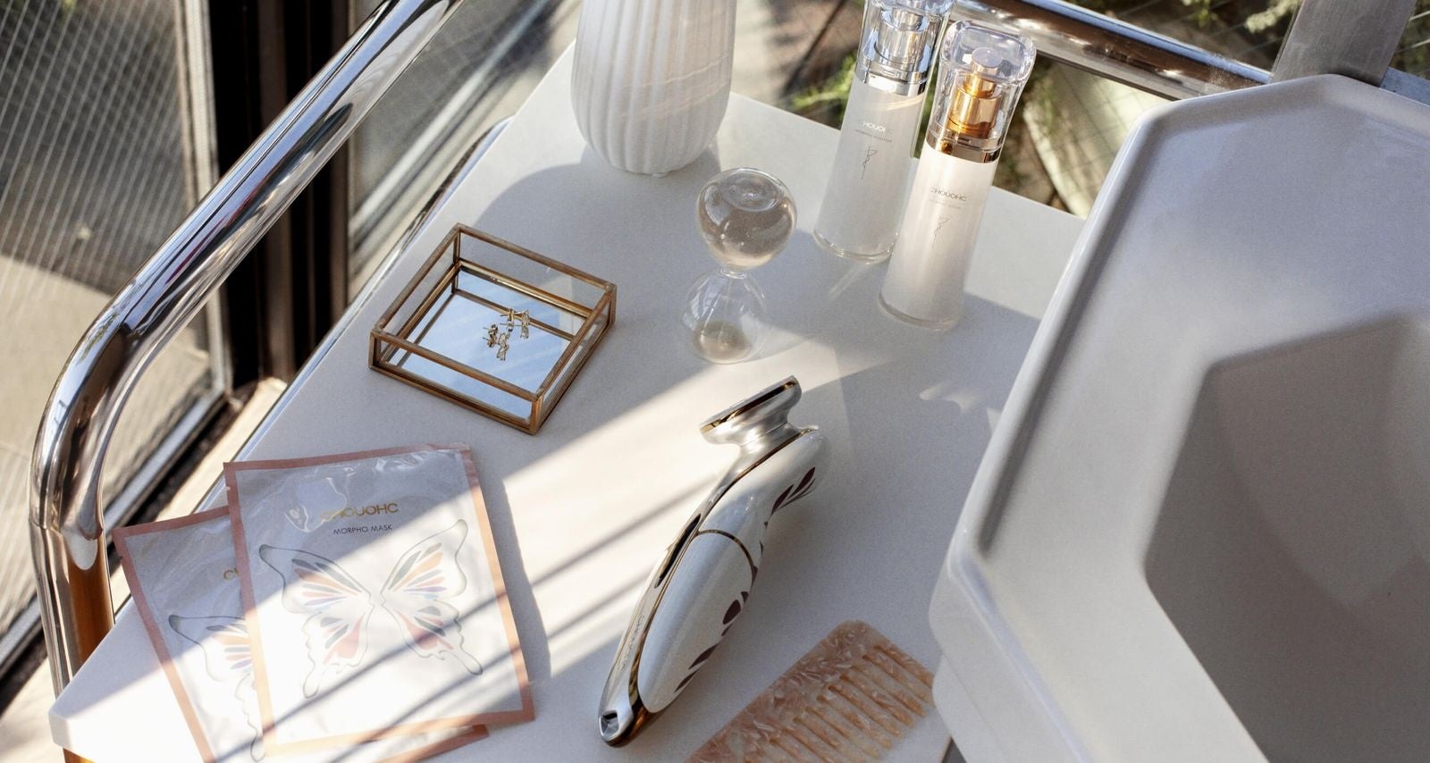 世界的に有名なブランド ELLEと<CHOUOHC>とのコラボレーションが実現!これを記念して、特別セットにはELLEが書き下ろしたデザインがパッケージを彩ります。ELLE発祥の地フランスでは、日常の中で美と健康を維持するための小さなアクションを心がけているそうです。そんなフレンチ・ライフスタイルを、The Morpho(ザ・モルフォ)美顔器を使った朝のスキンケアでご提案します。