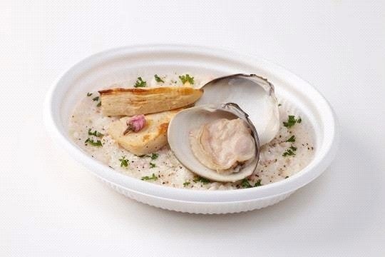 はまぐりと筍を使用し、桜の花びらを飾った、春らしく仕上げたチーズリゾット。うまみを足すためにうす口醤油を使い仕上げています。