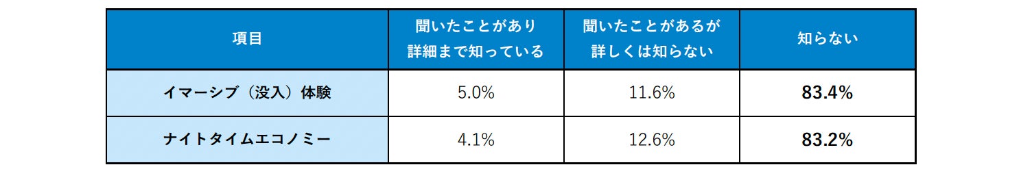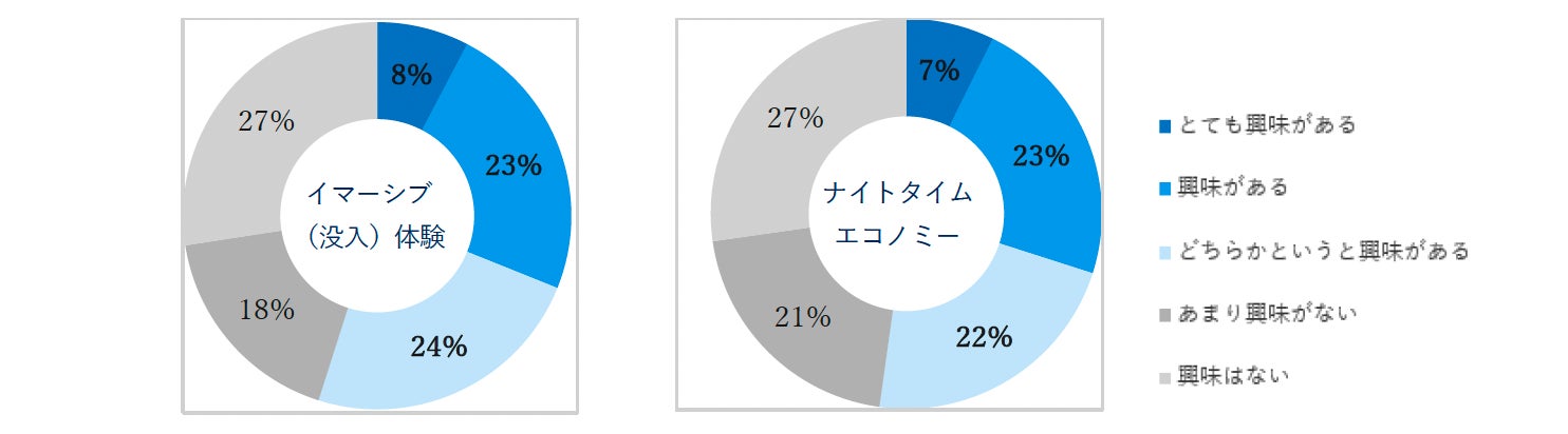 旅トレンドと予測するこの2つのキーワードについて、編集部でアンケートを実施したところ、80%以上が「知らない」と回答し認知度はこれからですが、20~30代では半数以上が興味を示す結果となりました(P2参照)。「イマーシブ(没入)体験」は “その場でしか体験できない”特別感に加え、コンテンツの拡充による期待値も高い状況です。一方「ナイトタイムエコノミー」は、夜も外で過ごす習慣が強いインバウンドの急増や、 “宿泊先でのんびりする”だけでなく、外食を楽しむなど旅先での過ごし方の多様性が広がったこともあり、今後はインバウンドだけでなく日本人の間でも夜の観光への関心が高まるのではないでしょうか。