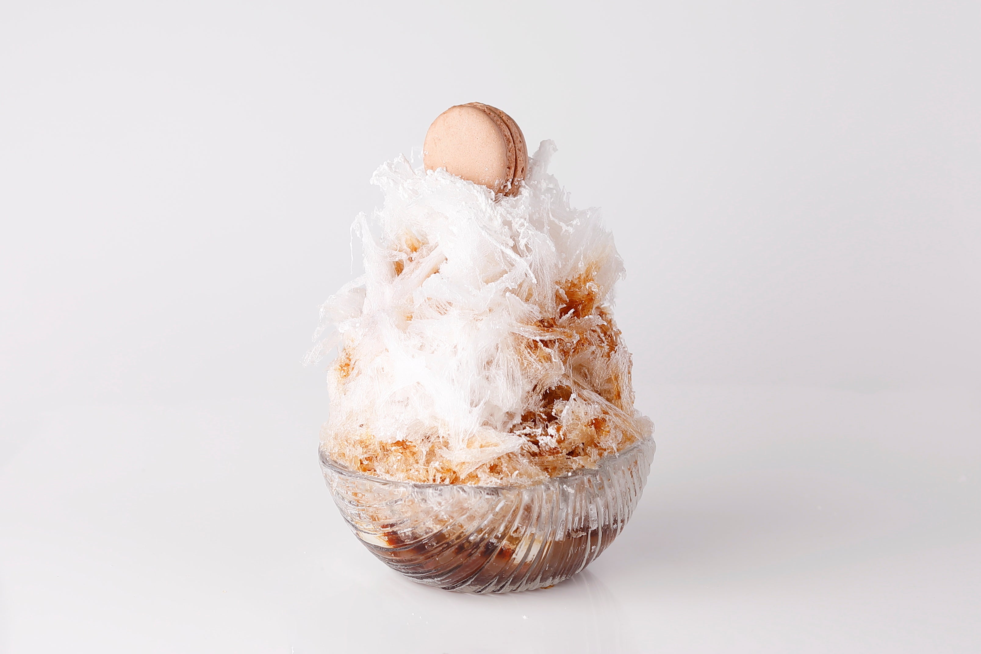 天然氷の中に白玉・羊羹ゼリー・黒蜜あんこをしのばせ、和三盆ソースをあしらいました。隠し味に"藻塩"を使うことで、和三盆糖のやわらかい甘みがさらに引き立ちます。和三盆と黒蜜、藻塩が絶妙なバランスで調和した、シンプルなれど奥深い味わいのかき氷です。