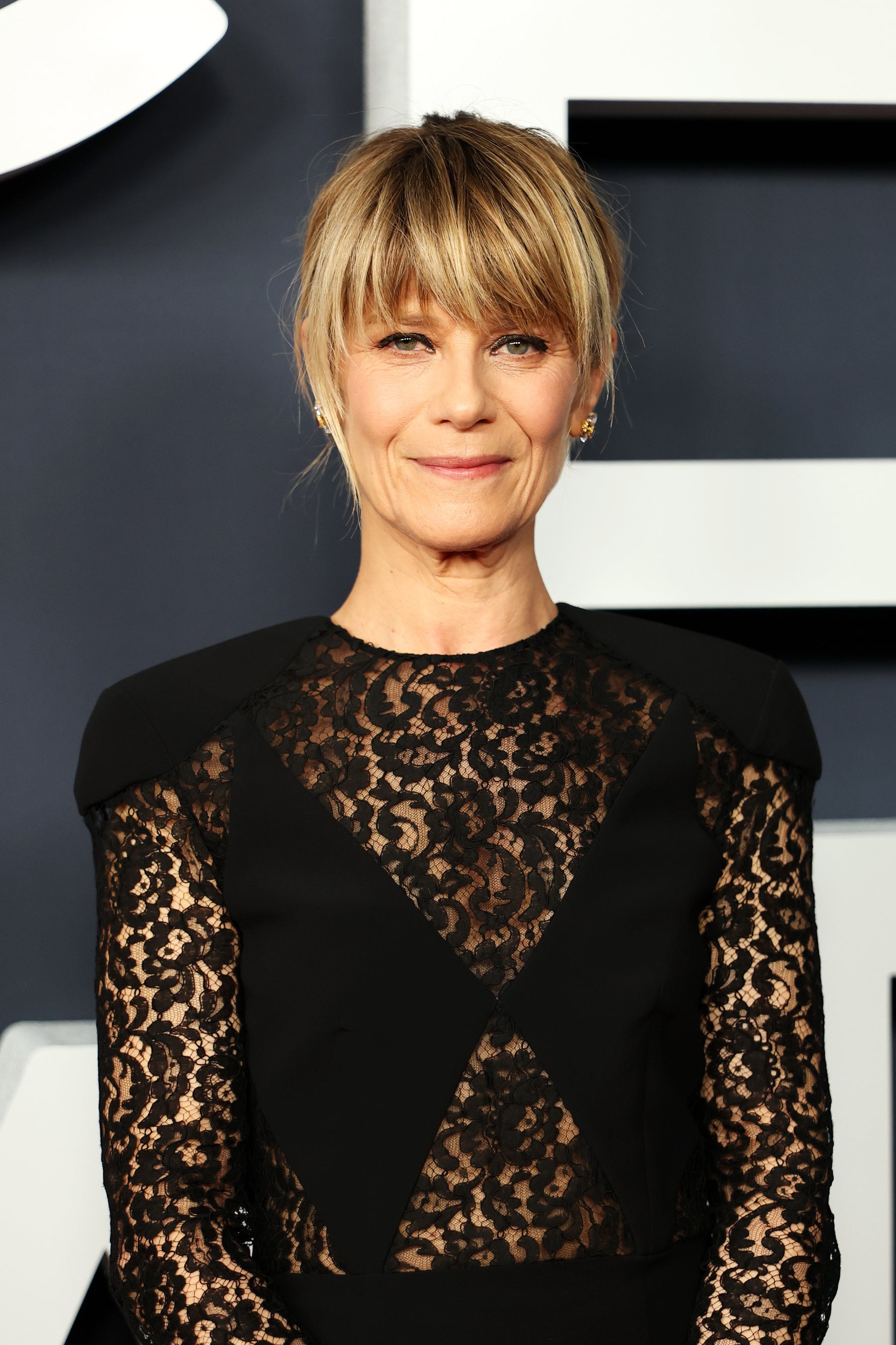 マリーナ·フォイスは、ブラックのシルクキャディとレースのドレスに、ブラックのサテン製プラットフォームシューズ、そしてブラックレザーのポシェットを合わせました。