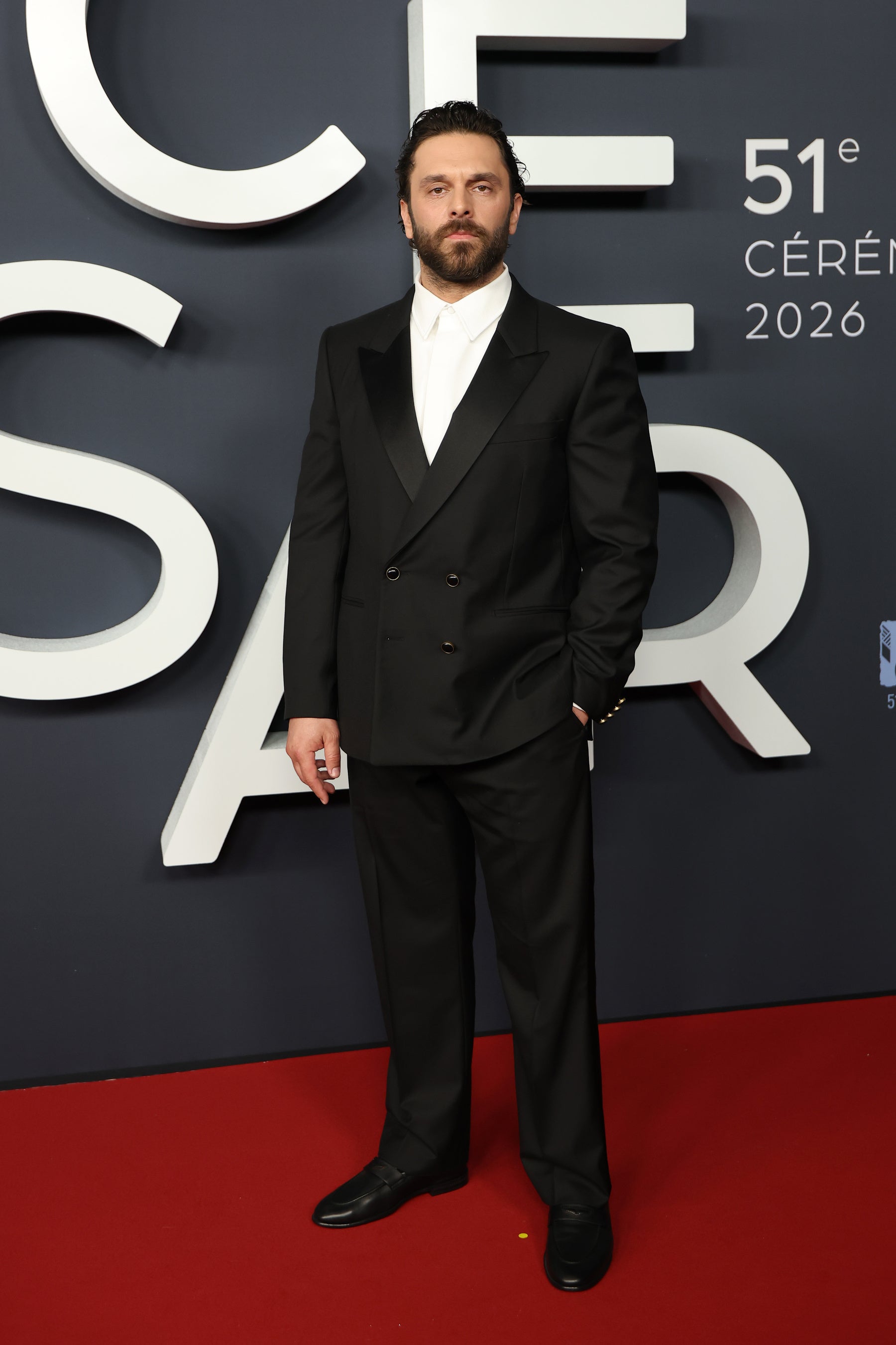 ピオ·マルマイは、ブラックのダブルブレストタキシードジャケットに、ブラックのタキシードパンツ、ホワイトシャツ、ブラックレザーの「LV ジェント ローファー」をコーディネートしました。