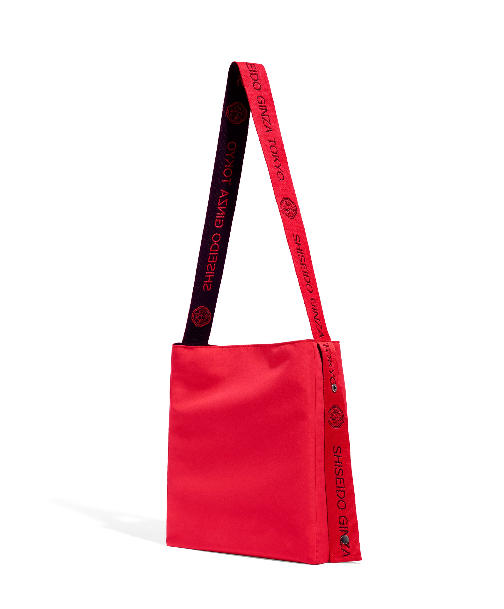 ○SHISEIDOを象徴するアライブな赤色と、カメリアマークとロゴをあしらったリボンショルダー。