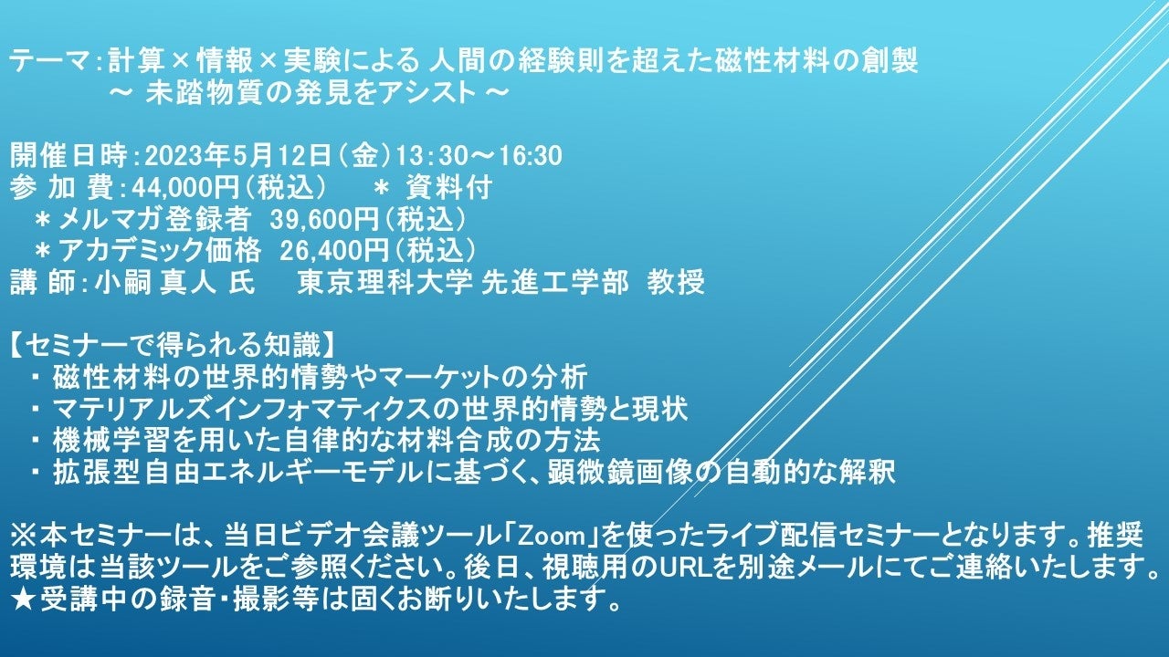 先端技術情報や市場情報を提供している(株)シーエムシー・リサーチ(千代田区神田錦町: https://cmcre.com/ )では、 各種材料・化学品などの市場動向・技術動向のセミナーや書籍発行を行っておりますが、 このたび「計算×情報×実験による 人間の経験則を超えた磁性材料の創製〜 未踏物質の発見をアシスト 〜」と題するセミナーを、 講師に小嗣 真人 氏 東京理科大学 先進工学部 教授)をお迎えし、2023年5月12日(金)13:30より、 ZOOMを利用したライブ配信で開催いたします。 受講料は、 一般:44,000円(税込)、 弊社メルマガ会員:39,600円(税込)、 アカデミック価格は26,400円(税込)となっております(資料付)。