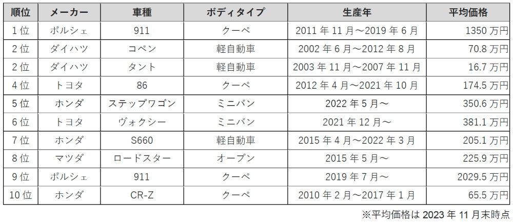 2023年は、スポーツカーとして多くの人にとって憧れの存在であるポルシェ 911の先代モデル(991型)がイヤーカーの栄冠に輝きました。毎年上位にはランクインしていましたが、“指名買い”が特徴とも言える本年度のランキングで底力を見せつけた形となりました。その他10位以内には、引き続きスポーツカー(クーペ、オープン)が多くランクインし、コロナ禍以降の注目度の高さを継続しております。