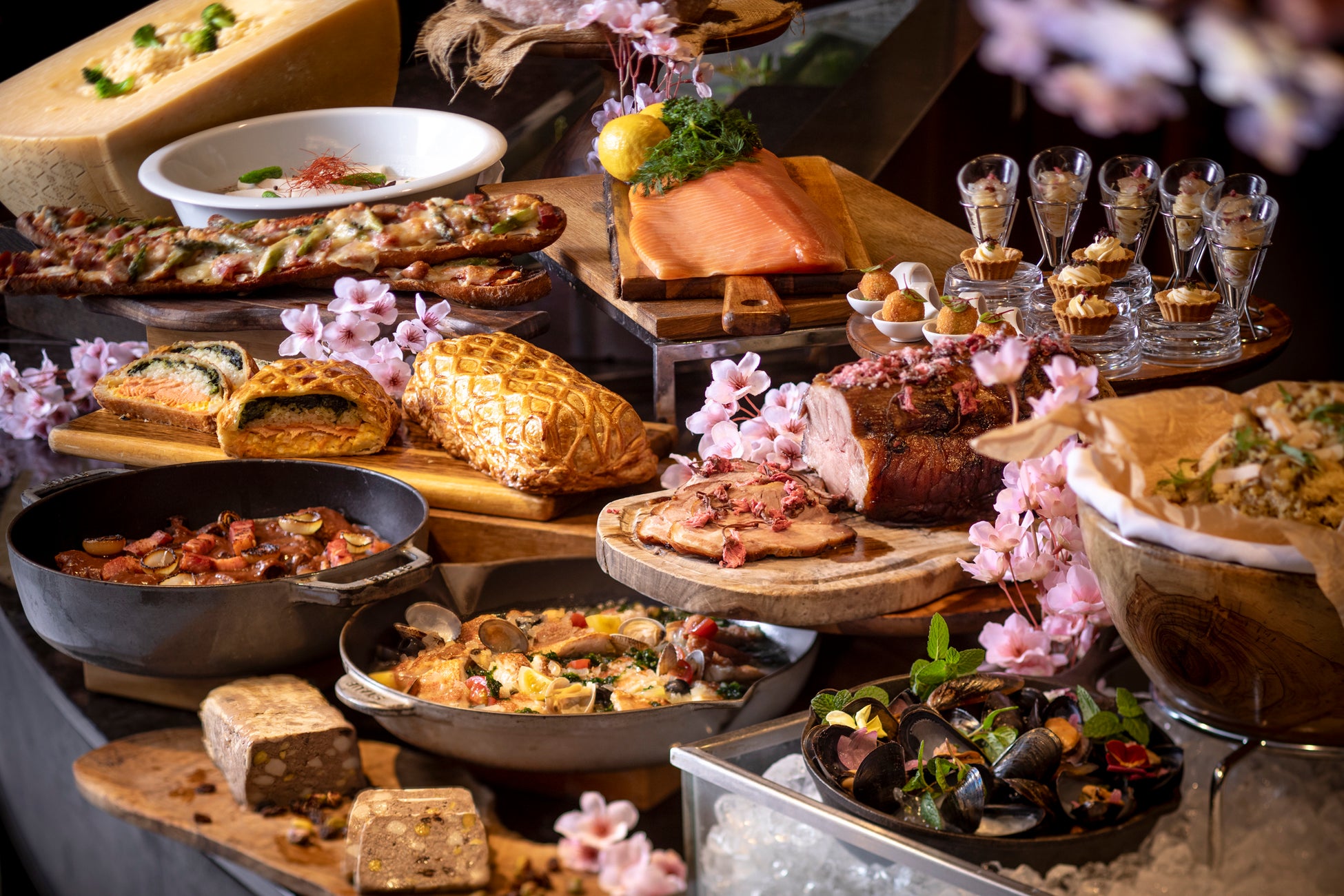 また、ランチビュッフェでは冷製料理から温製料理まで、バラエティ豊かなメニューをご用意しました。『ポークロティ 桜のマリネ 焦がしバターのソースで』は、ジューシーなポークロティに桜のほのかな塩味と春の香りを添え、焦がしバターのコクが味わいを引き締める、季節感あふれる一品です。