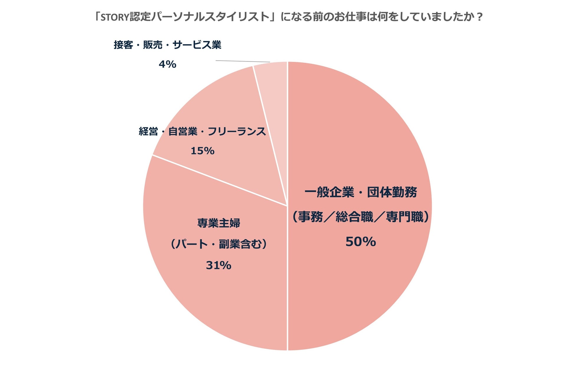 会社員、自営やフリーランスの方を合わせると、69%が仕事を持っていた方が「STORY認定パーソナルスタイリスト」になっています。一般企業・団体勤務経験者が5割を占めていますが、デザイン会社の経営やフリーアナウンサー、イメージコンサルタントなど、その働き方には多様性も見られます。一方で、パート・副業を含む専業主婦も3割ほどおり、「家庭から再び社会へ出てセカンドキャリアを作りたい」という流れも見て取れます。