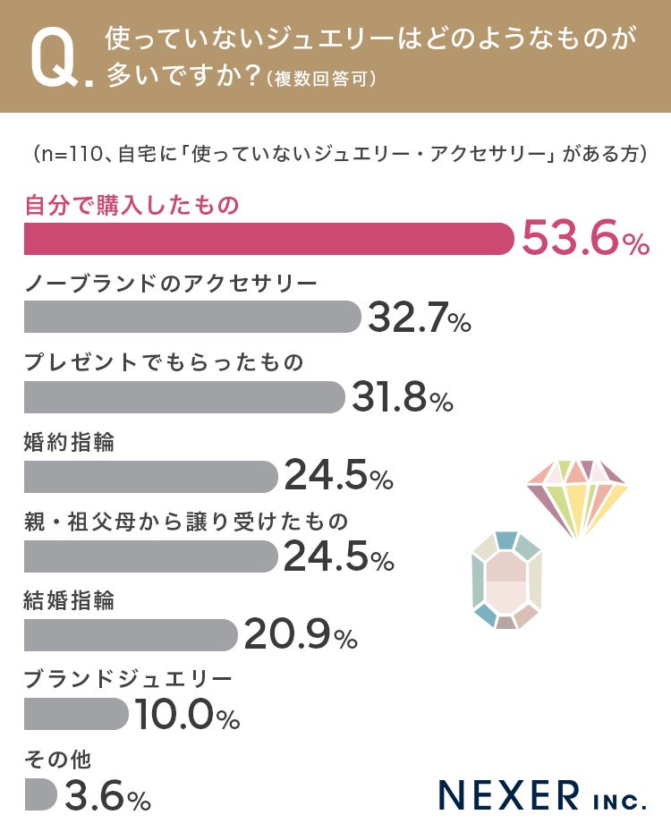 最も多かった回答は「自分で購入したもの」で53.6%でした。次いで「ノーブランドのアクセサリー」が32.7%、「プレゼントでもらったもの」が31.8%となっています。半数以上の方が、自分で選んで買ったジュエリーを使わなくなっていることがわかります。