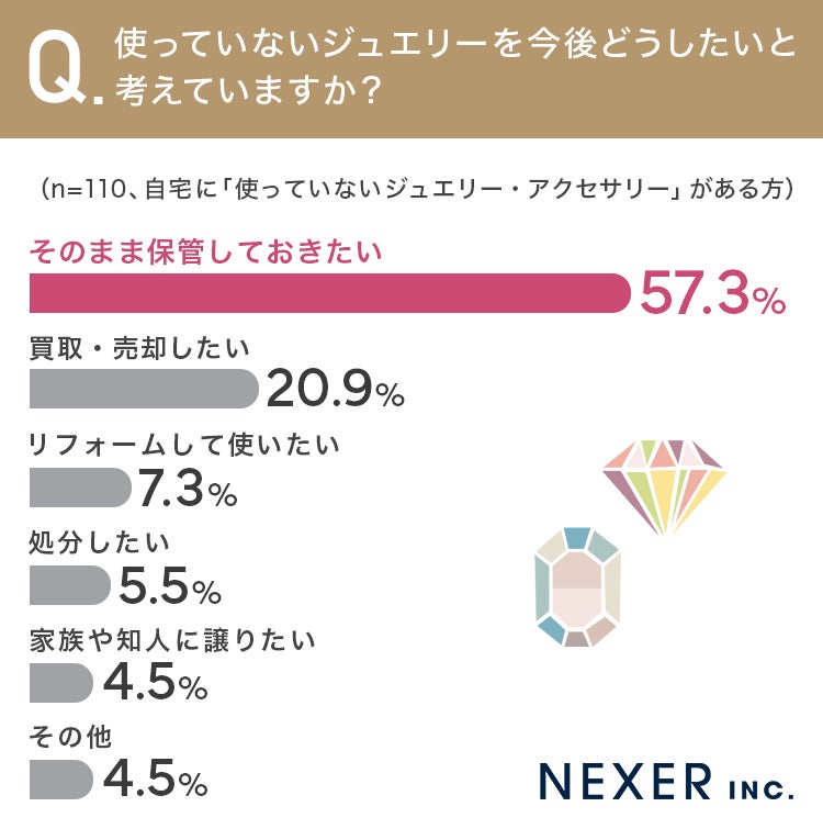 今回の調査では、全体の約2割の方が自宅に使っていないジュエリーを持っており、そのうち半数以上が「そのまま保管しておきたい」と考えていることがわかりました。保管を選ぶ方の多くは、思い出や愛着が理由として挙げられています。