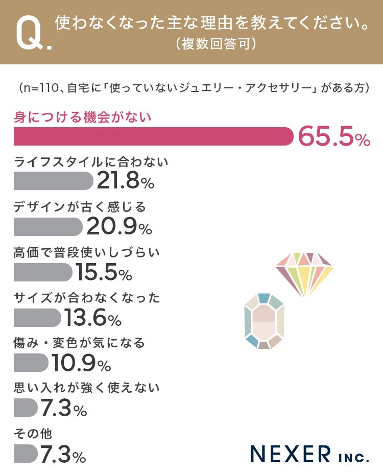 圧倒的に多かったのが「身につける機会がない」で65.5%でした。6割以上の方が、ジュエリーそのものへの不満ではなく、ライフスタイルの変化により身につけるタイミングを失っていることがわかります。