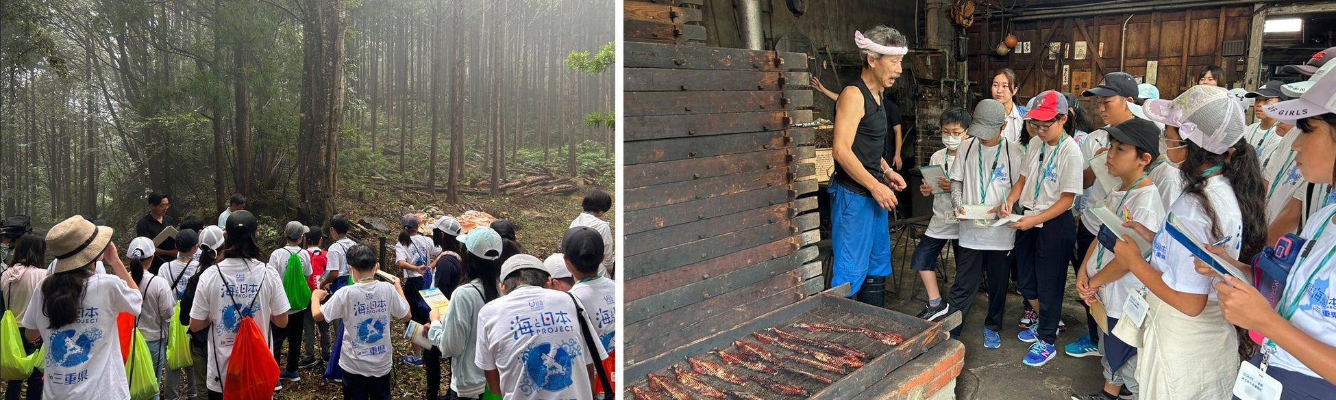 さらに、海と山の自然の循環に守られてきた尾鷲市で120年以上続く老舗海産物店「大瀬勇商店」を訪れ、水産加工工場を見学。こちらでは、水揚げされた「かつお」を保存可能にし、骨まで食べられるようにするくん製の技術を使って商品を製造していて、子どもたちは、実際にいぶされたかつおを試食するなど、先人たちが発展させてきた加工技術を身をもって学びました。