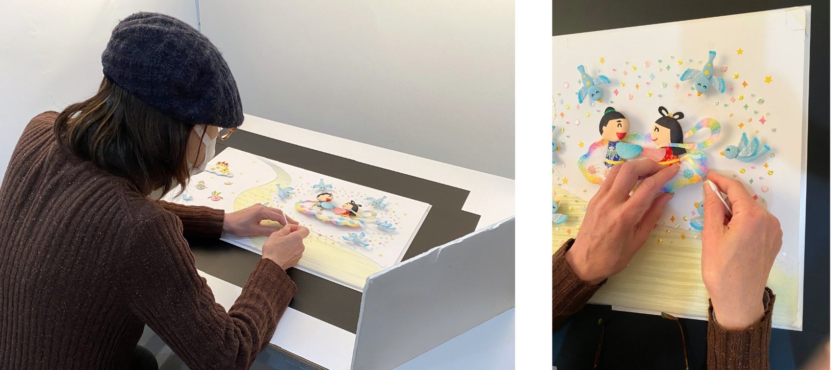 また、紙・布・綿・粘土でひとつひとつ作られた半立体の制作画は、温かい気持ちをはぐくみます。書籍内の二次元コードから絵本の制作工程の動画も見られるのも楽しいポイントです。