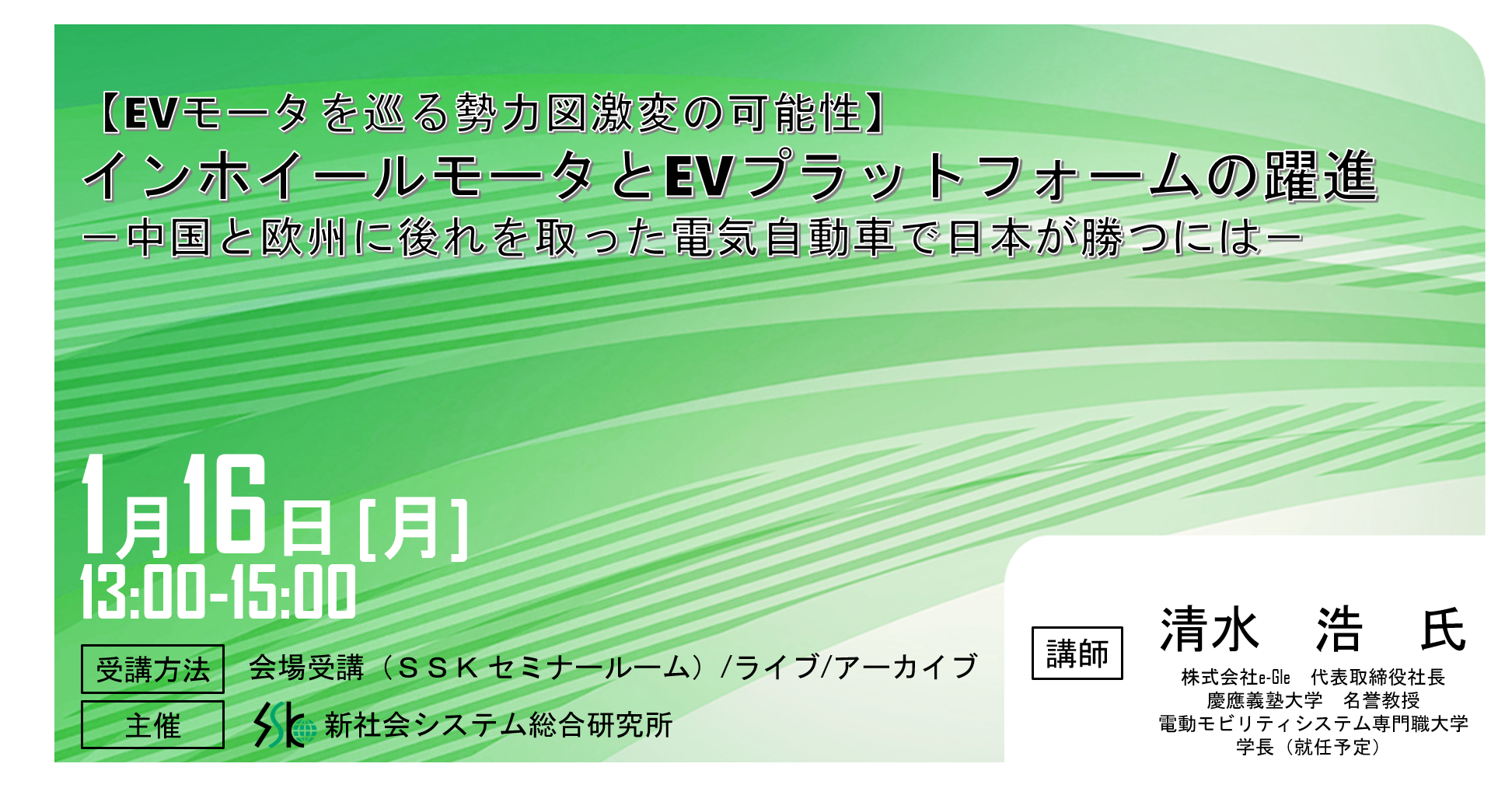 「インホイールモータとEVプラットフォームの躍進」と題して、株式会社e-Gle 代表取締役社長/慶應義塾大学 名誉教授 清水 浩 氏のセミナーを2023年1月16日(月)に開催!!