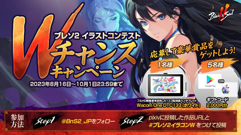 期間中、「ブレイドアンドソウル2」公式イラストコンテストへ応募されたご自身の応募作品URLに、ハッシュタグ「#ブレソ2イラコンW」をつけてポスト(ツイート)された方の中から、抽選で合計6名様に、液晶ペンタブレットやギフトコード2,000円分などをプレゼントします。