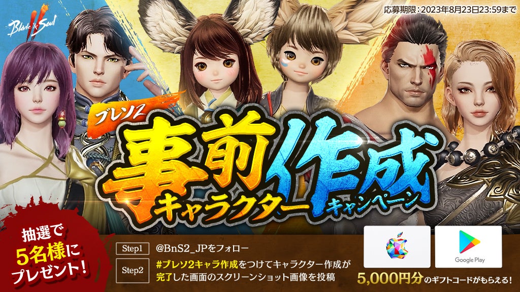 期間中、事前にキャラクター作成を完了した画面のスクリーンショット画像を「#ブレソ2キャラ作成」をつけてポスト(ツイート)してくれた人の中から抽選で、ギフトコード5,000円分をプレゼントします。