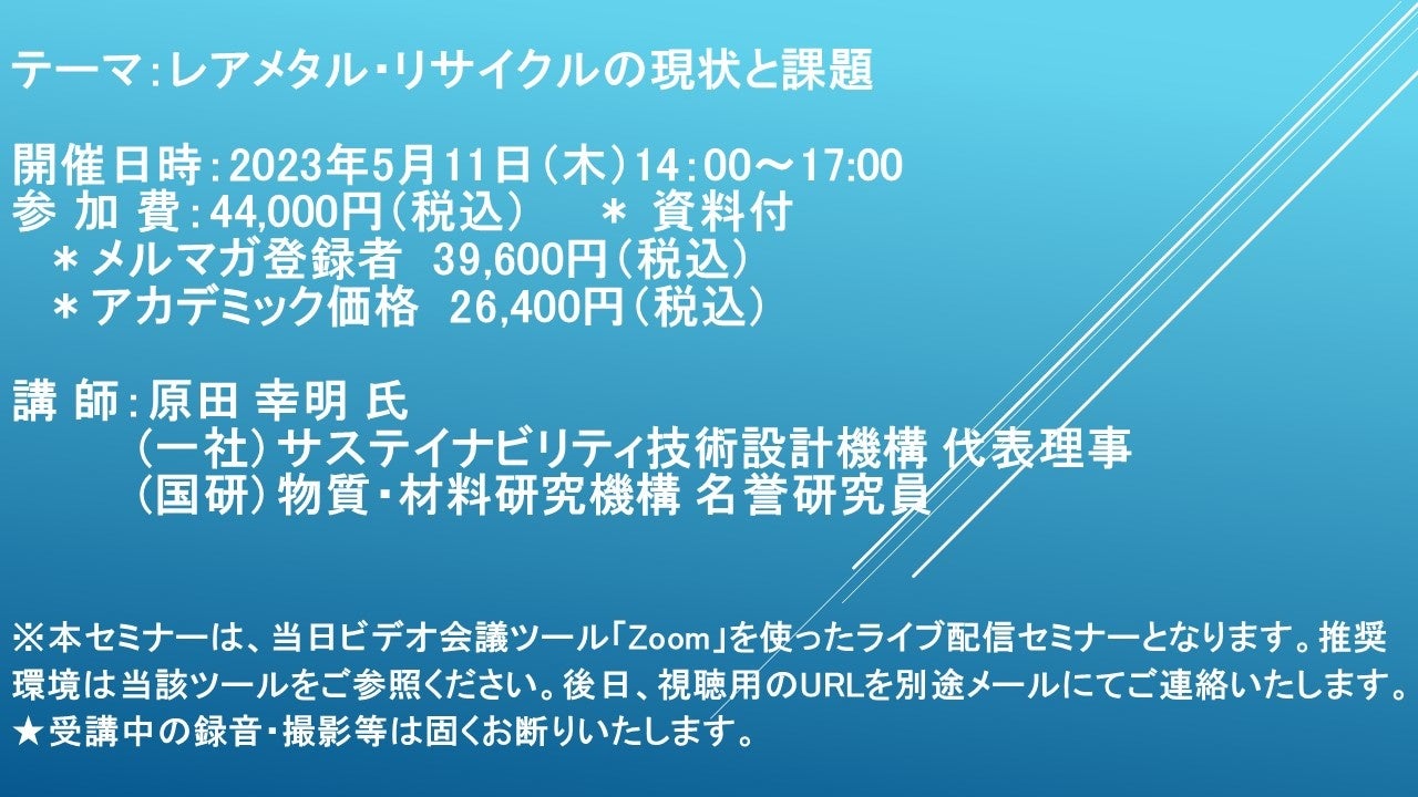 先端技術情報や市場情報を提供している(株)シーエムシー・リサーチ(千代田区神田錦町: https://cmcre.com/ )では、 各種材料・化学品などの市場動向・技術動向のセミナーや書籍発行を行っておりますが、 このたび「レアメタル・リサイクルの現状と課題」と題するセミナーを、 講師に原田 幸明 氏 ((一社) サステイナビリティ技術設計機構 代表理事 (国研) 物質・材料研究機構 名誉研究員)をお迎えし、2023年5月11日(木)14:00より、 ZOOMを利用したライブ配信で開催いたします。 受講料は、 一般:44,000円(税込)、 弊社メルマガ会員:39,600円(税込)、 アカデミック価格は26,400円(税込)となっております(資料付)。