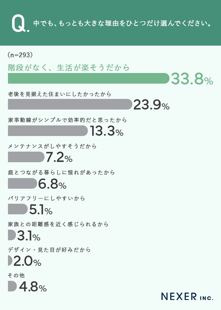 こちらでも「階段がなく、生活が楽そうだから」が33.8%でトップとなりました。3人に1人が、階段のない暮らしを最大の決め手として挙げています。次いで「老後を見据えた住まいにしたかったから」が23.9%、「家事動線がシンプルで効率的だと思ったから」は13.3%でした。