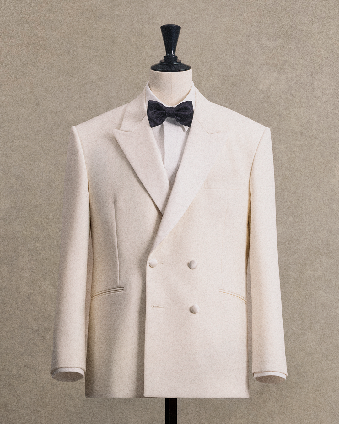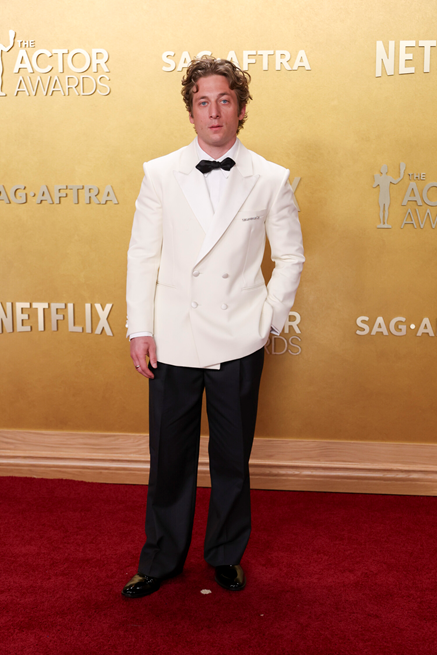 ジェレミー·アレン·ホワイトが着用したホワイトのダブルブレストタキシードジャケットは、上質なウールブレンド素材で仕立てられ、洗練されたサテンのラペルとサテンカバーのボタンが特徴です。シルク製の蝶ネクタイをあわせることで、スタイルに一層の格調を添えています。タキシードシャツには、高品質なシーアイランドコットンを使用し、ウールパンツは、最新のショーで導入された新しいプリーツディテールにより、シルエットの美しさを際立たせています。