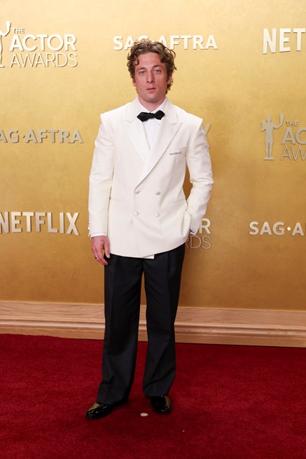 ジェレミー·アレン·ホワイトは、ホワイトのダブルブレストタキシードジャケットにダークグレーのツープリーツパンツ、ホワイトのピケ素材タキシードシャツ、ブラックの蝶ネクタイ、ブラックのパテントレザー オックスフォードシューズを合わせました。