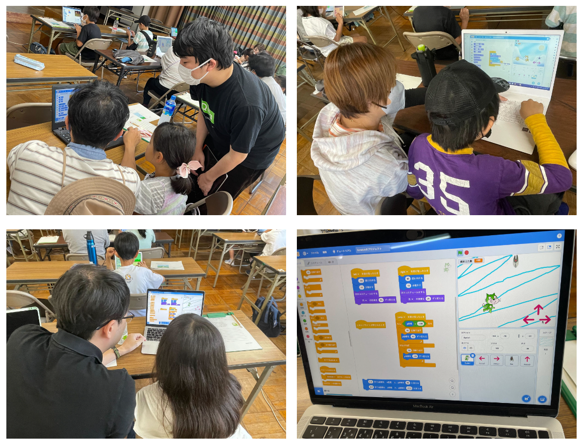 今回のプログラミング講座はScratch(プログラミング言語)を使用し、プログラミングの基礎理解から、キャラクターを動かしてゲームを作るまでの過程を、実際にパソコンを使って子どもたちが楽しく学べるような内容となっています。