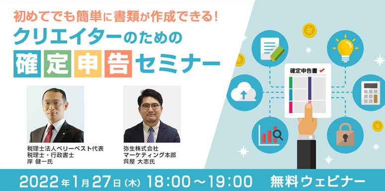 第1部では、税理士の岸 健一氏をお招きし、確定申告の具体的なノウハウについてお話を伺います。第2部では、弥生の確定申告ソフトを活用した確定申告の流れを、弥生株式会社の担当者よりレクチャーしていただきます。確定申告ソフトを使用したことがない方や、今使っている確定申告ソフトを見直したい方など、デモをもとにわかりやすくイメージいただける内容です。なお、当日ご参加いただいた方には、講師による貴重な情報の詰まった資料もプレゼント。ご興味をお持ちのクリエイターの方は、ぜひご参加ください。