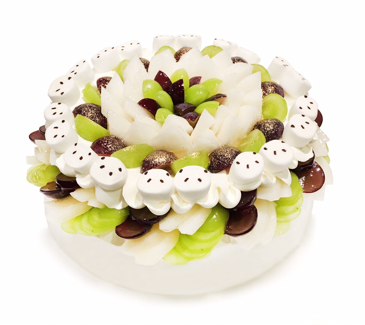 ぶどう、和梨を合わせ、マシュマロで作ったかわいらしいパンダをのせたショートケーキです。