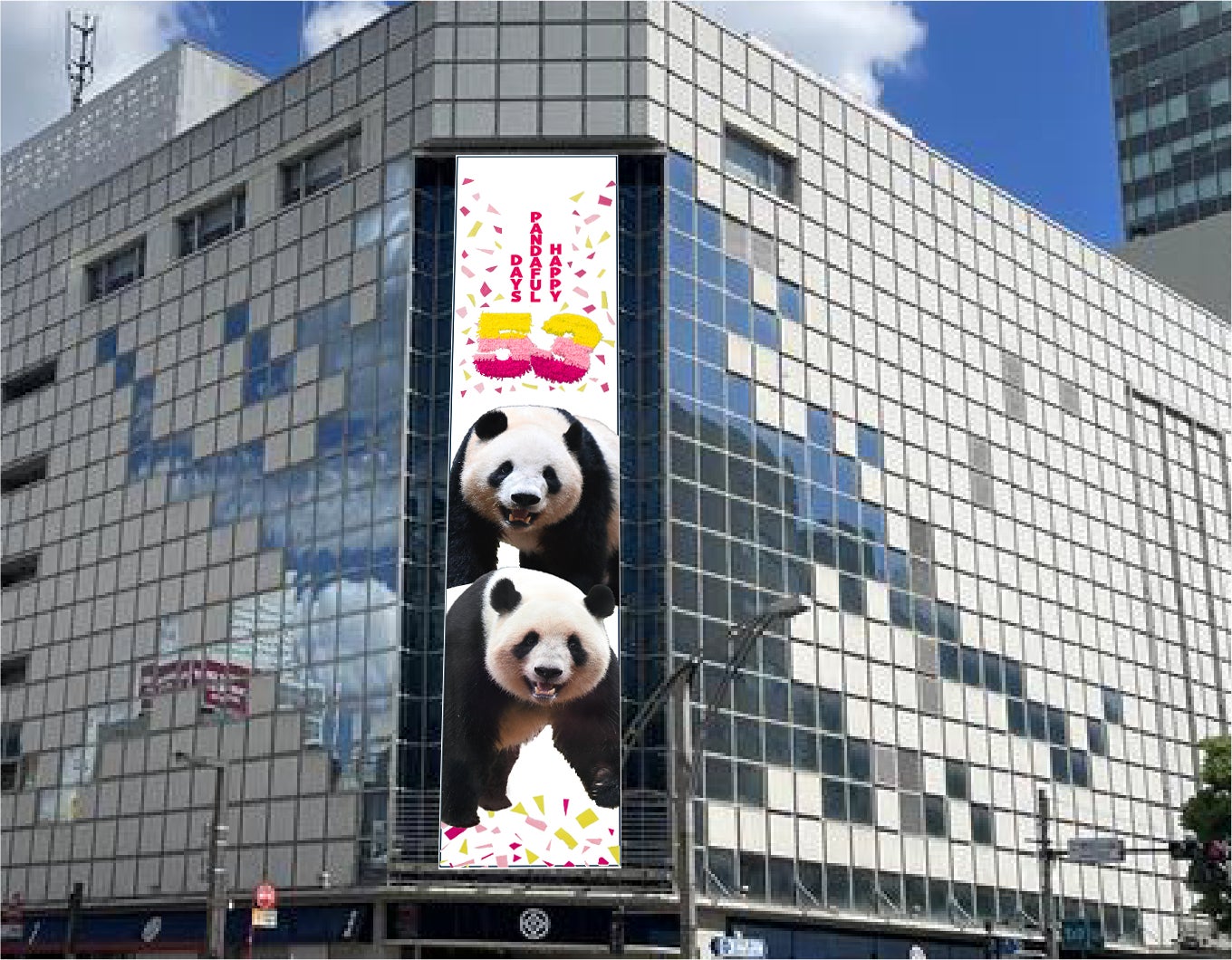 上野広小路交差点側外壁に縦約20m×横約4mのパンダデザインの広告幕が登場!