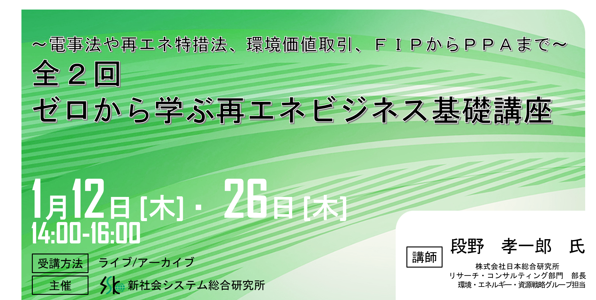 「全2回 ゼロから学ぶ再エネビジネス基礎講座」と題して、(株)日本総合研究所 リサーチ・コンサルティング部門 部長 段野 孝一郎氏のセミナーを2023年1月12日・26日(木)に開催!!