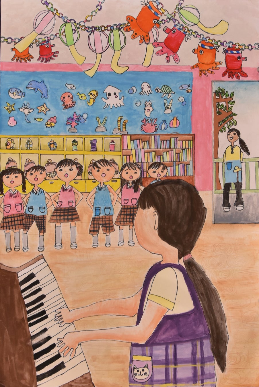 わたしにはようち園のときに2年間担任をもってくれた先生がいます。いつもニコニコしてとってもやさしくてわたしが一ばん大すきな先生です。その先生といっしょにようち園ではたらきたくてこの絵をかきました。先生におしえてもらったようにわたしも子どもたちにやさしくおしえてあげたいなと思います。そのすがたをこの絵のように先生にみてほしいです。