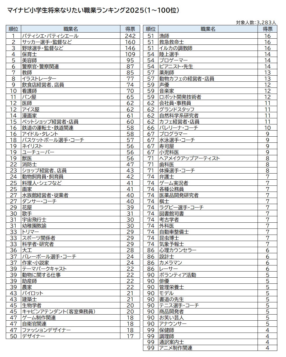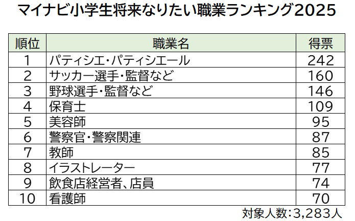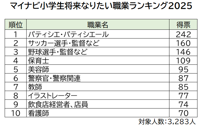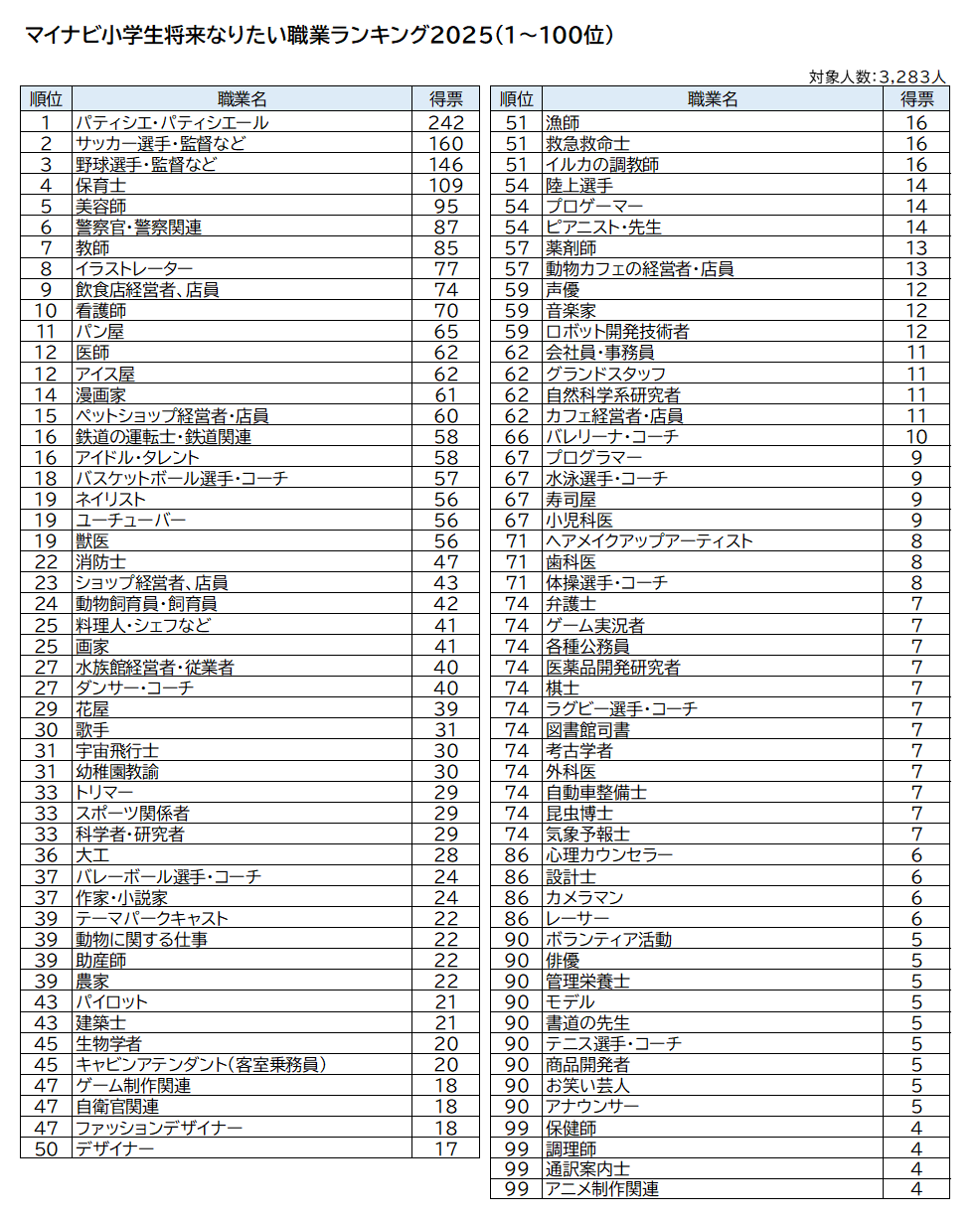 全国の小学生3,283件の応募データから算出した、将来なりたい職業ランキングのトップ10を発表します。