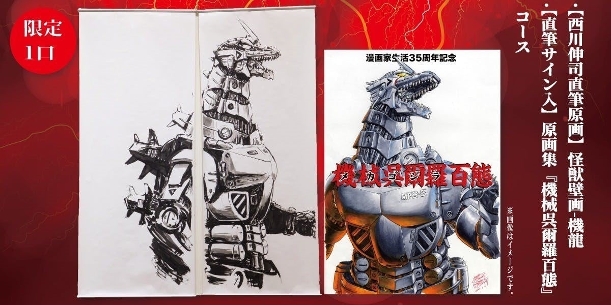 多くゴジラシリーズの怪獣デザイナーとしても活躍し、『ゴジラ×メカゴジラ』では“機龍”をデザインした西川伸司は、昭和に誕生した“メカゴジラ”を平成の時代に復活させ、ミレニアムに新たな“メカゴジラ”像を生み出した作家と云えます。漫画家生活35周年記念と“3式機龍” 生誕20周年を祝して開催される原画展『機械呉爾羅<メカゴジラ>百態』の描き下ろしなど原画展展示作品を網羅する “BOOSTER”限定版のプレミアムな画集を制作いたします。