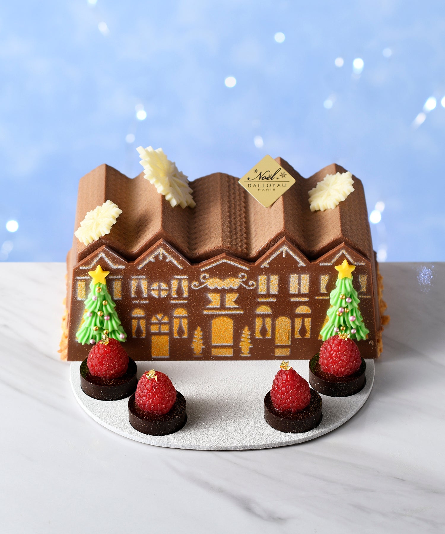 オレンジの香りのパンナコッタ、イチゴのジュレ、カカオのスポンジをマンゴーとパッションフルーツのなめらかなムースの中に入れ、カカオのサブレとコクのあるチョコレートクリームのタルトショコラと組み合わせました。エキゾチックな爽やかさとクリーミーなチョコレートの苦みのバランスが楽しめる新しいクリスマスケーキです。