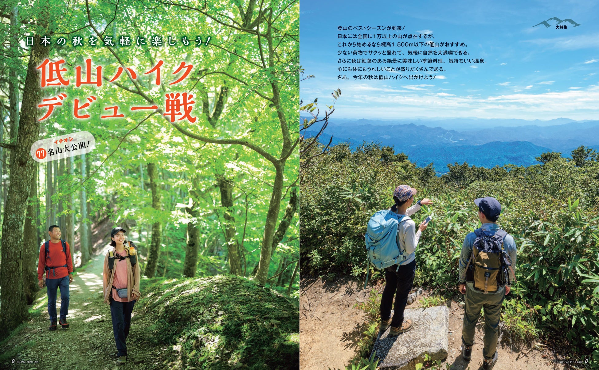 さらに、今号の大特集は「低山ハイクデビュー戦」。日本の秋を気軽に満喫できる低山の魅力満載! 初めての道具選びからプランの立て方、さらに一度は登りたい全国の低山リストまで大公開。ロープウェイでサクッと登れる絶景の山から、激ウマ山頂グルメまで、あなたにピッタリの山が見つかりますよ!